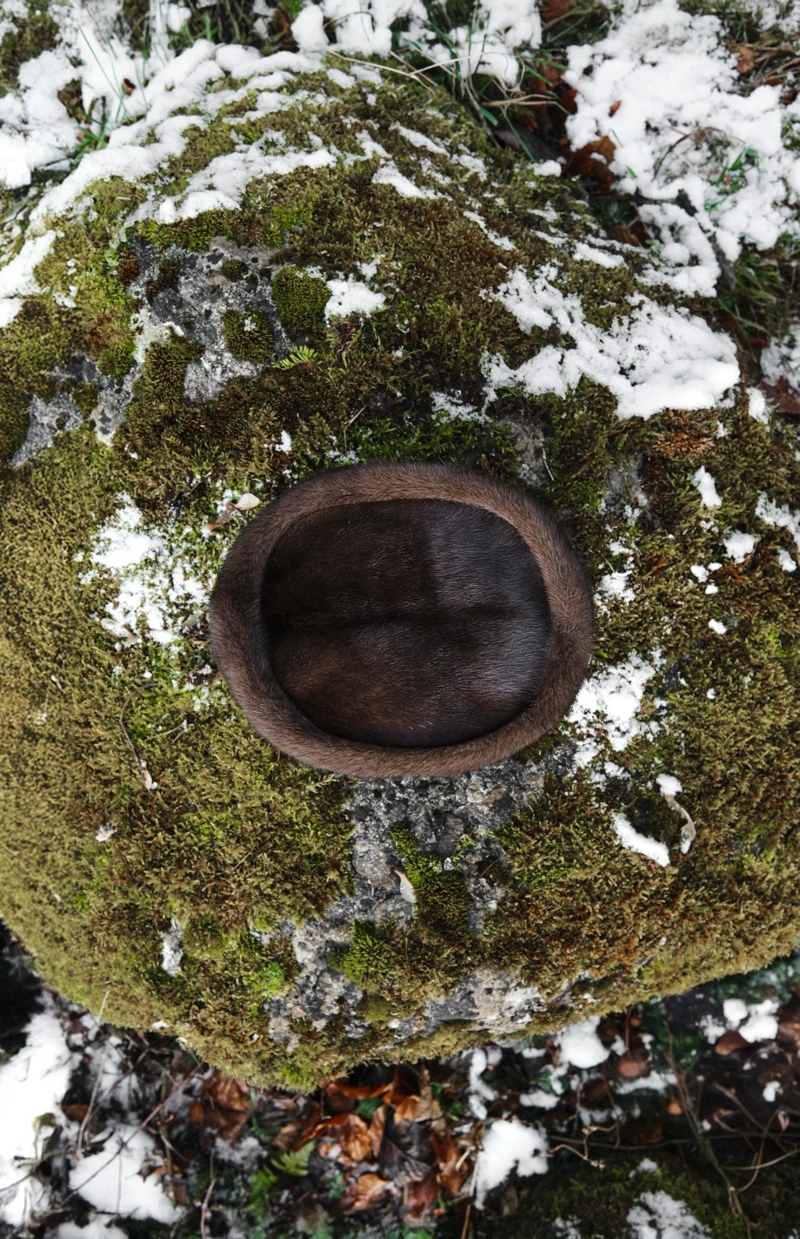 Der Nerzhut glänzt sanft im Licht und verleiht dem Accessoire ein repräsentatives und luxuriöses Aussehen.