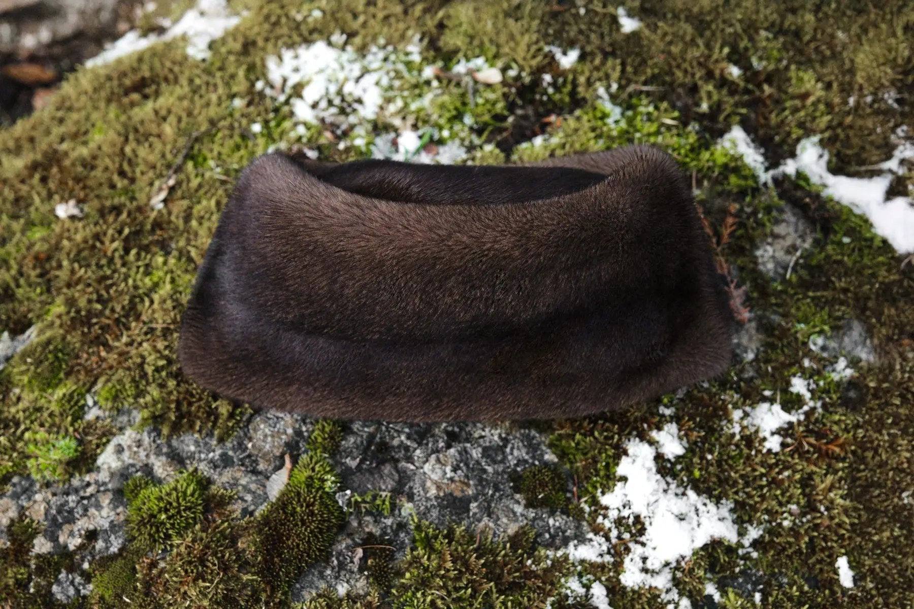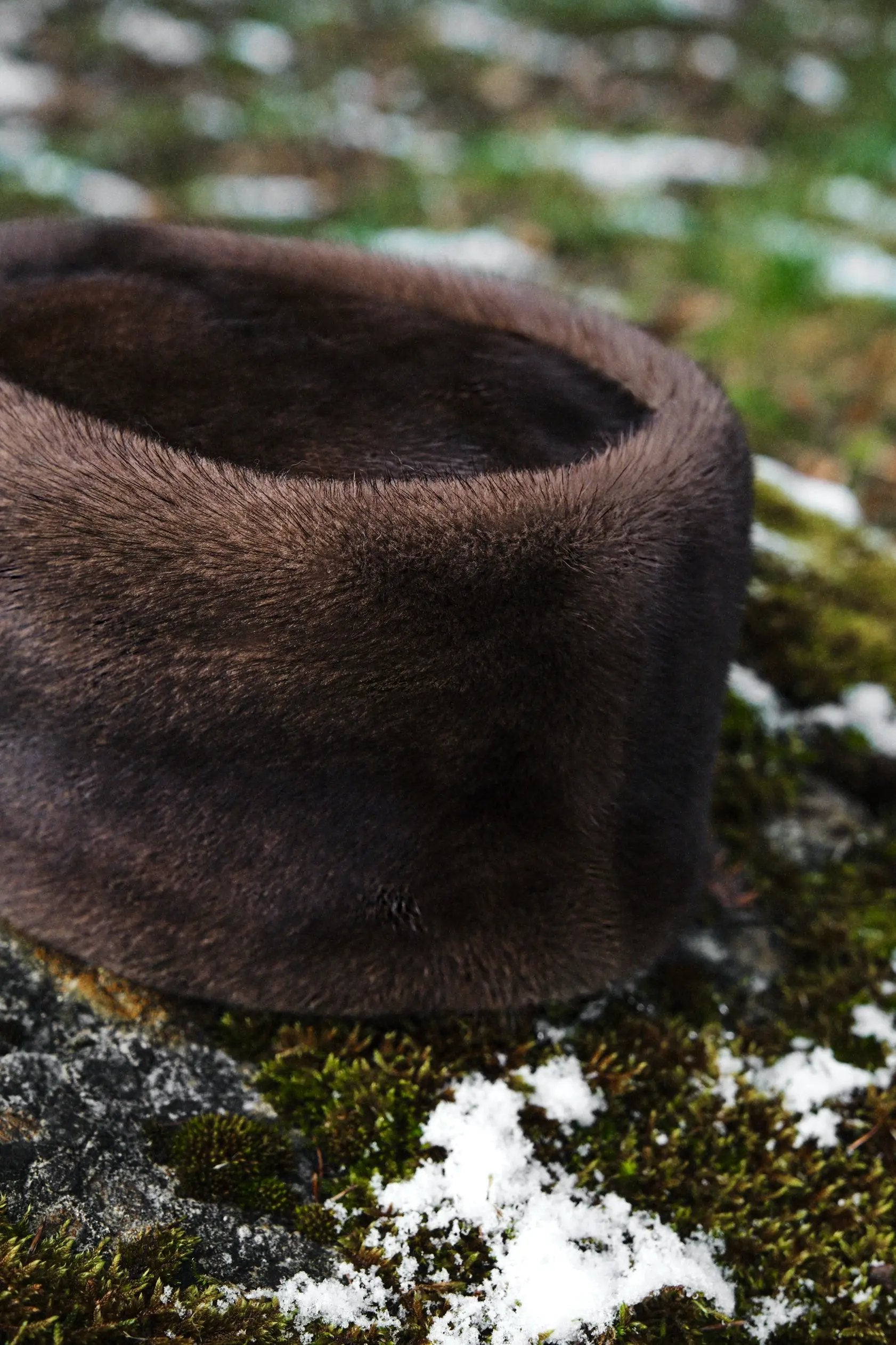 Die geformte Nerzmütze in einem edlen Nussbaumton umrahmt sanft die Gesichtszüge, während der klassische Schnitt dem Winterlook Eleganz verleiht.