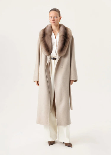 Das hellbeige Kaschmirmantel mit Schal-Zobelkragen sieht zart und raffiniert elegant aus und betont die Figur.