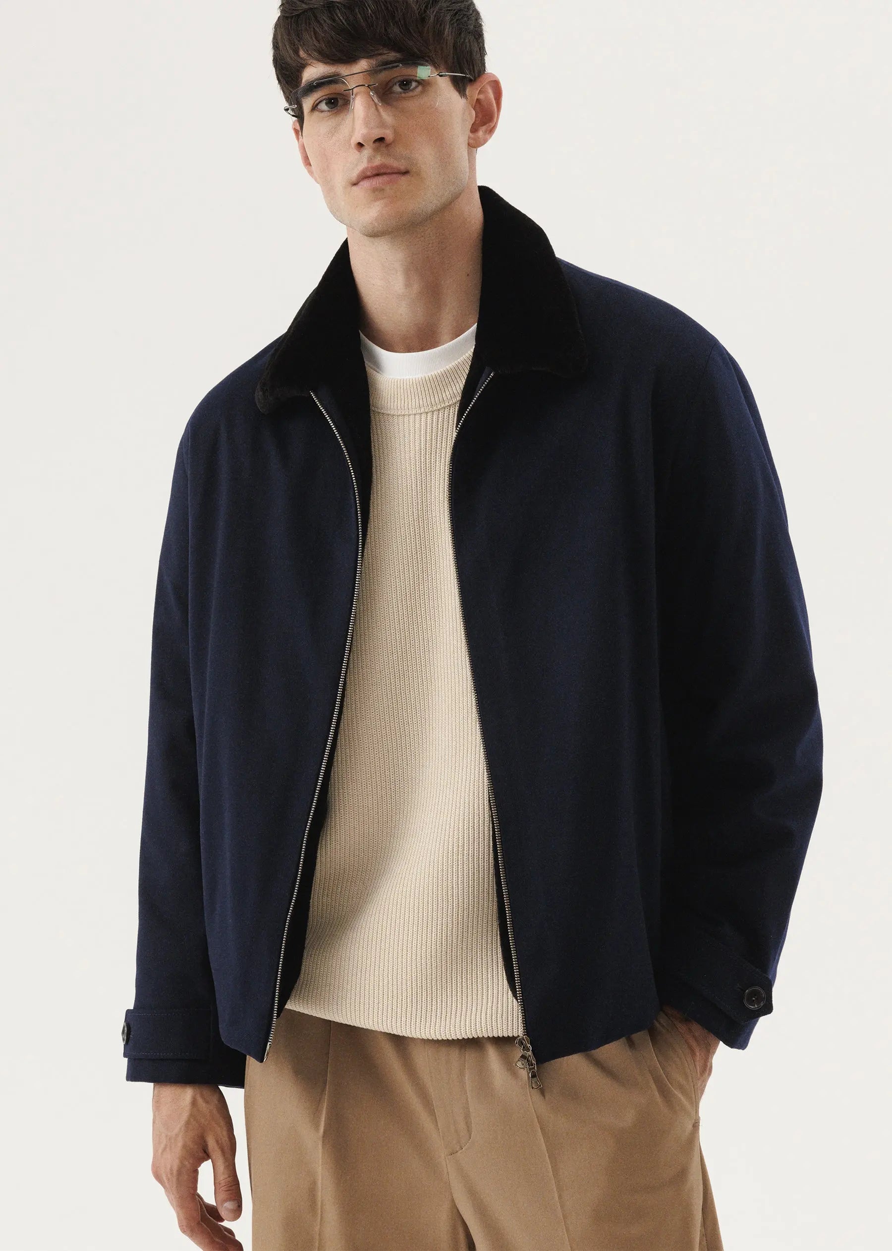 Eine gerade geschnittene Kaschmirjacke mit einer Unterlage aus geschorenem Nerz.