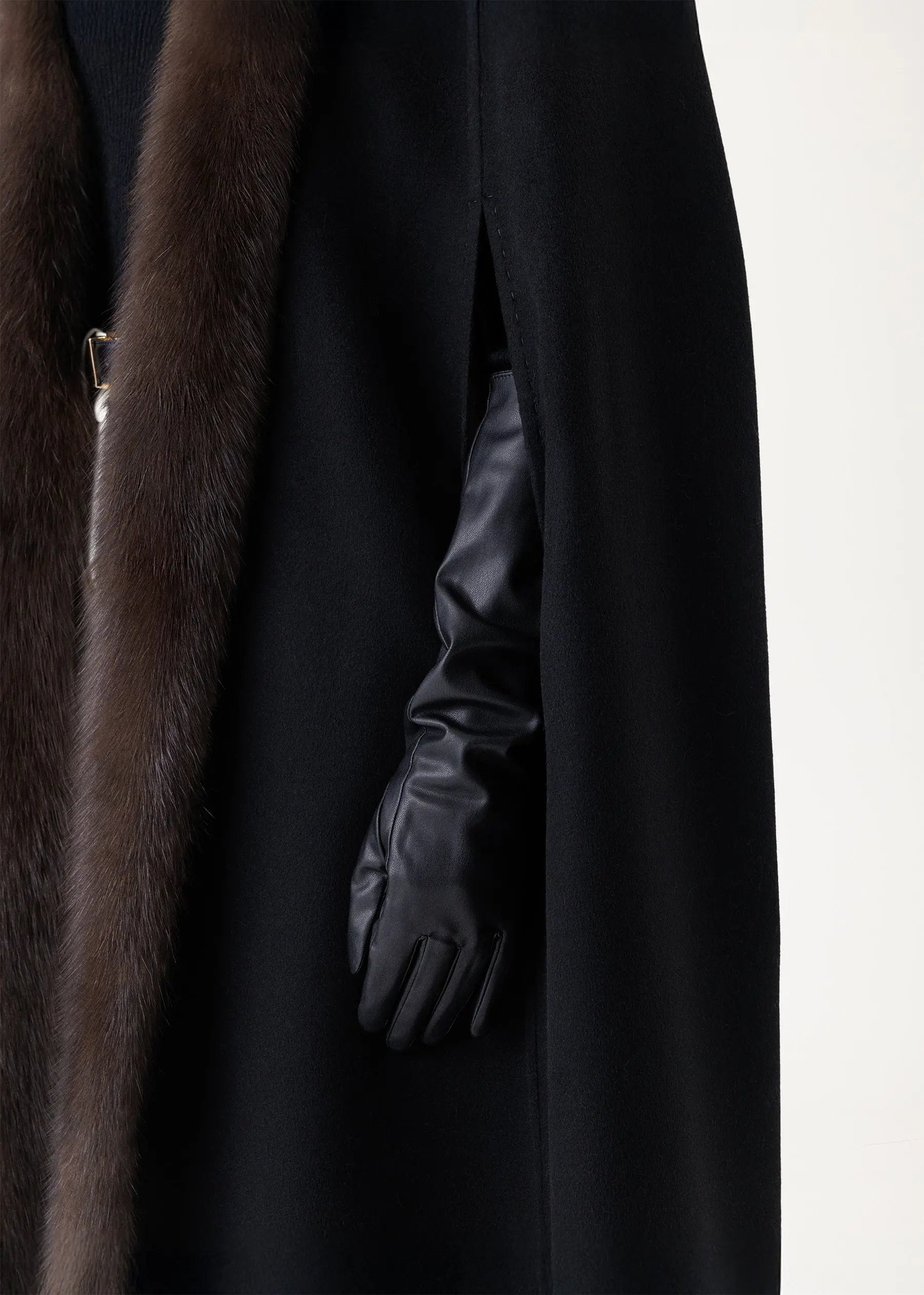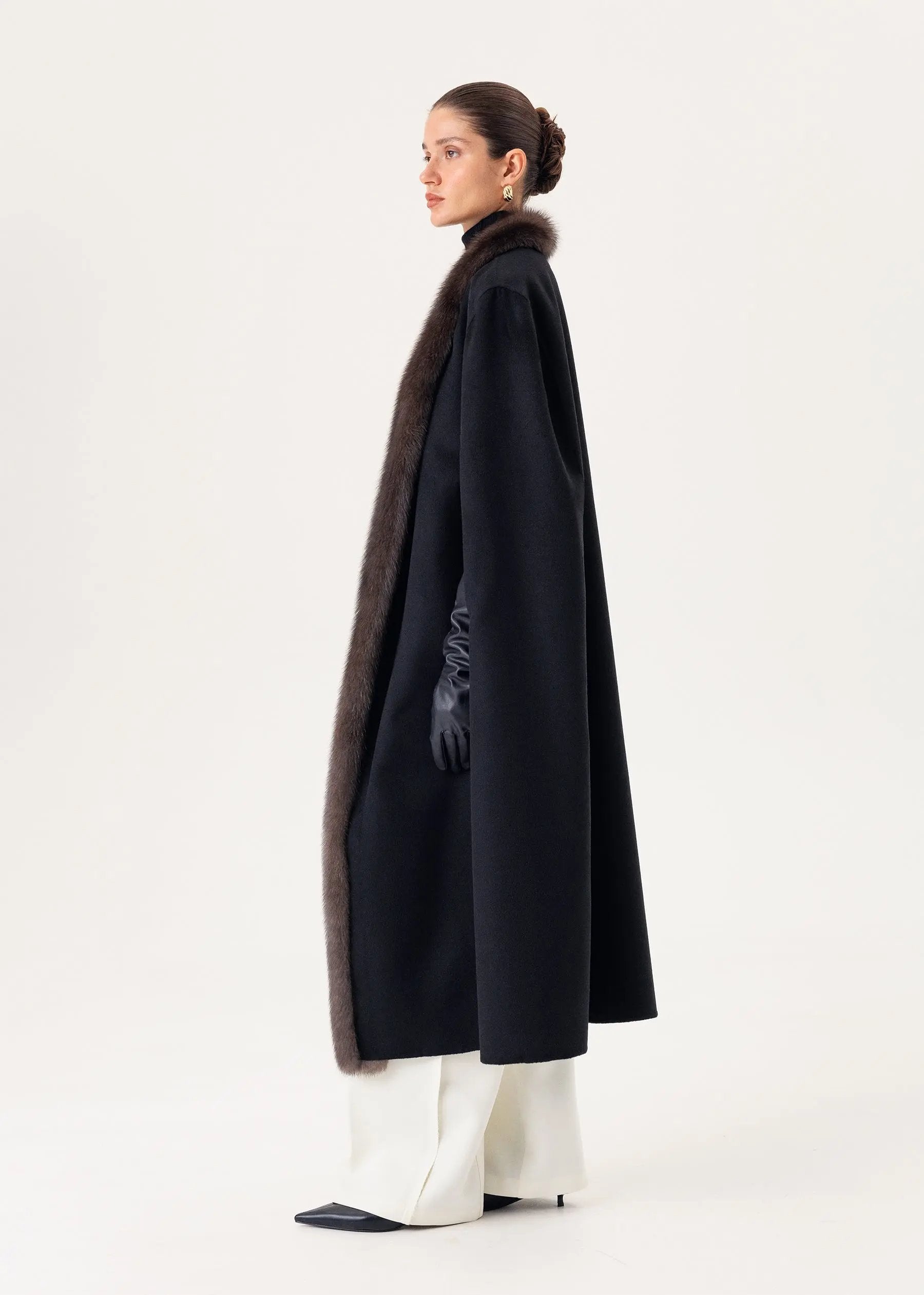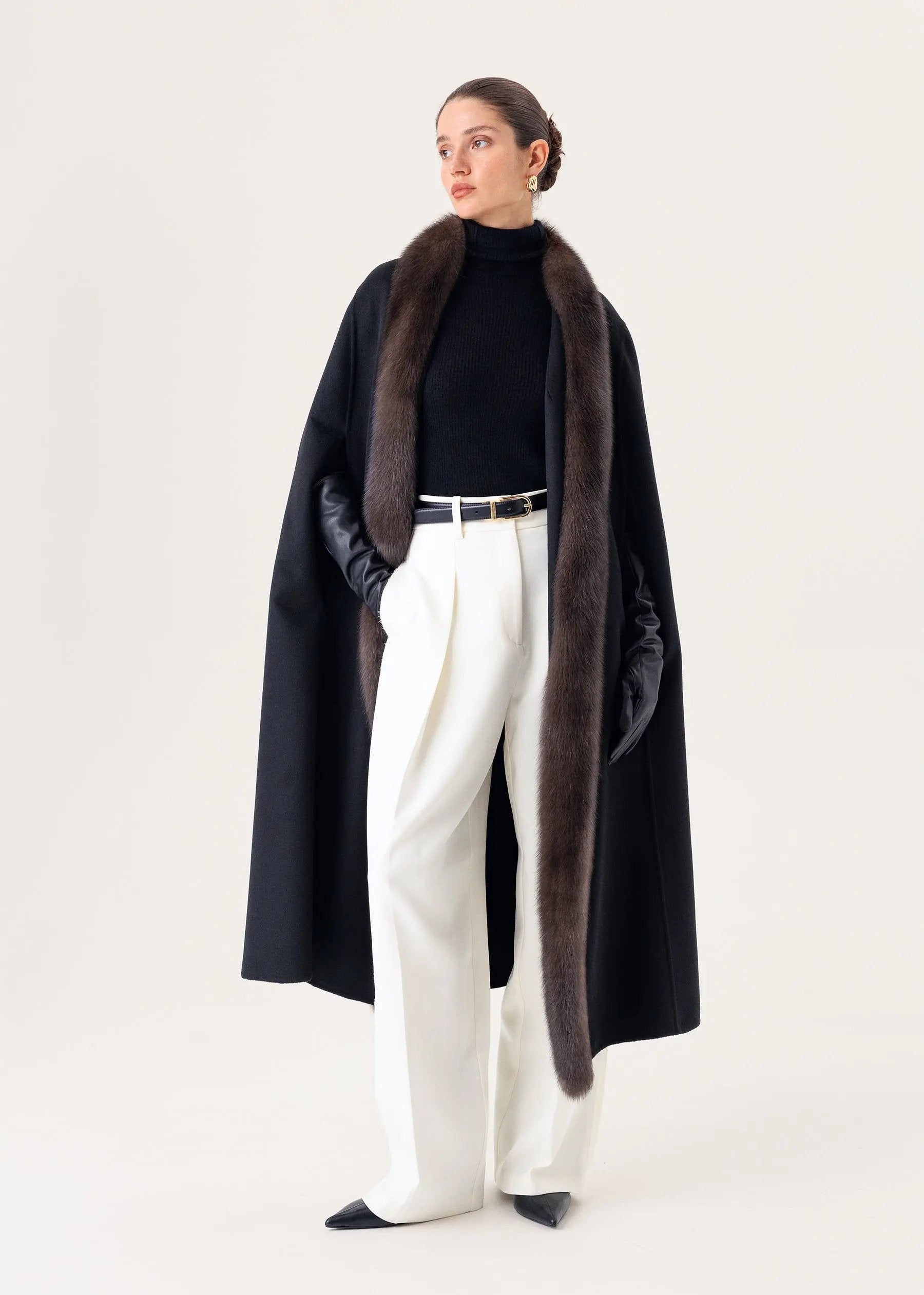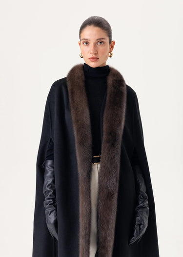 Der Cape aus Kaschmir in einem tiefen, edlen Farbton ist mit wertvollem Zobelfell verziert.