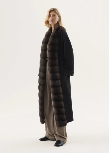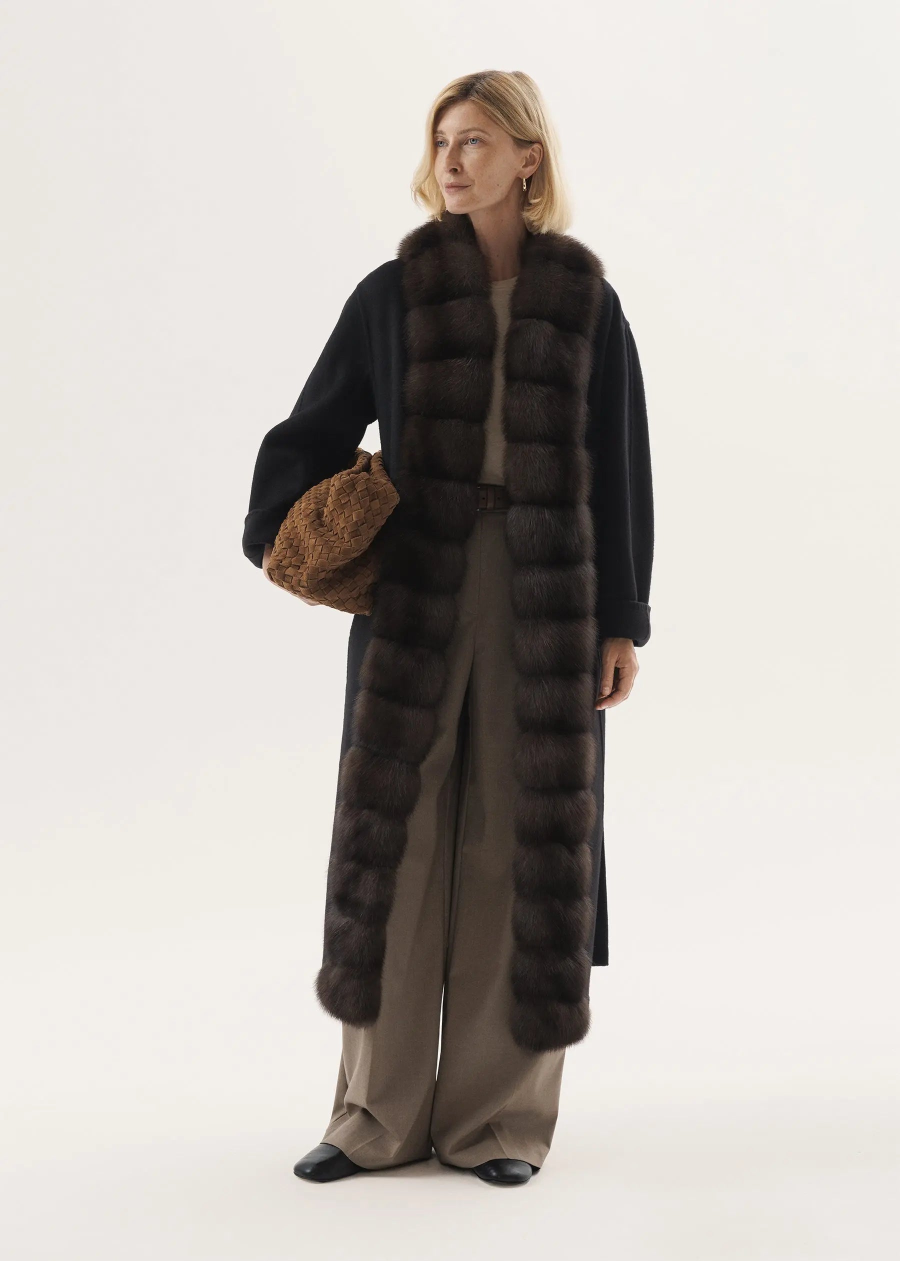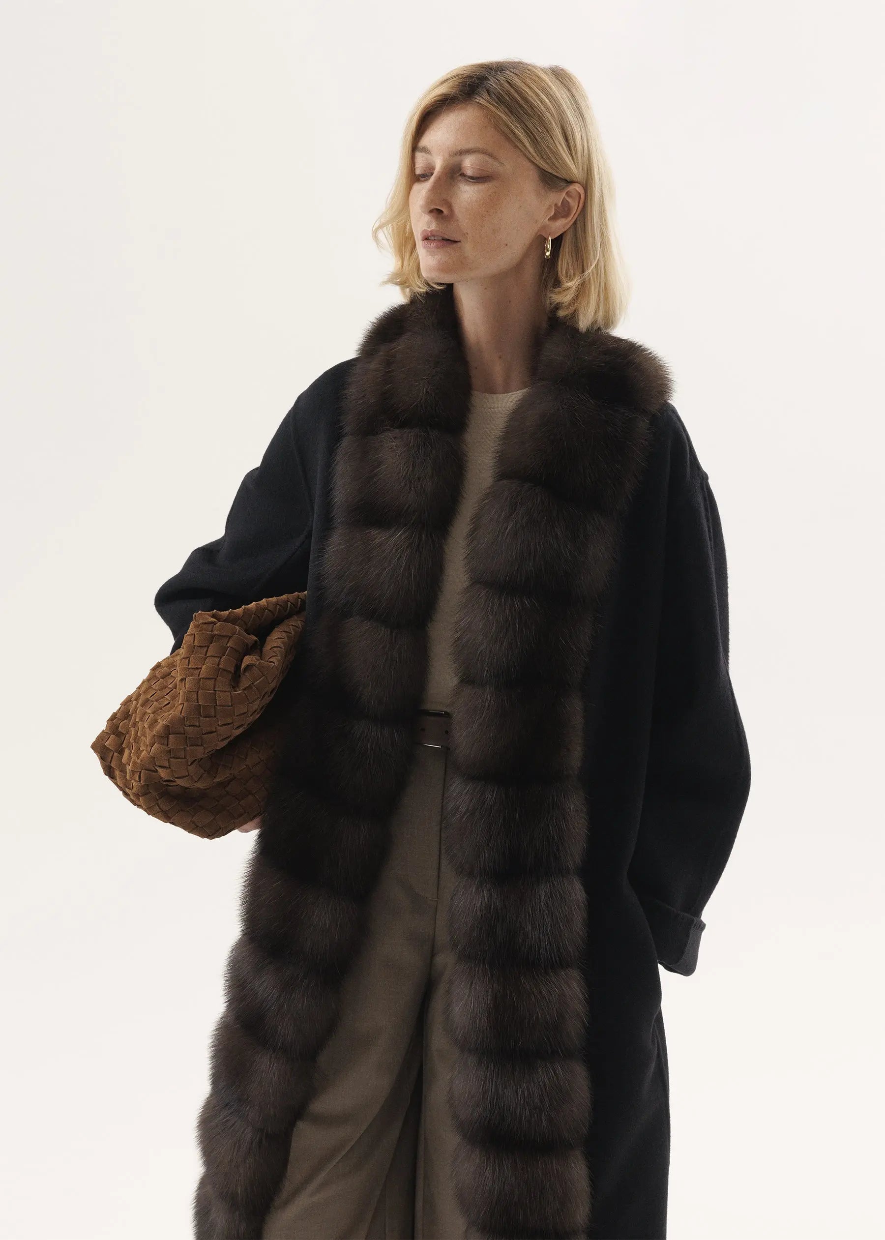 Der Zobelpelzbesatz am gerade geschnittenen, langen Mantel verlängert optisch die Silhouette.