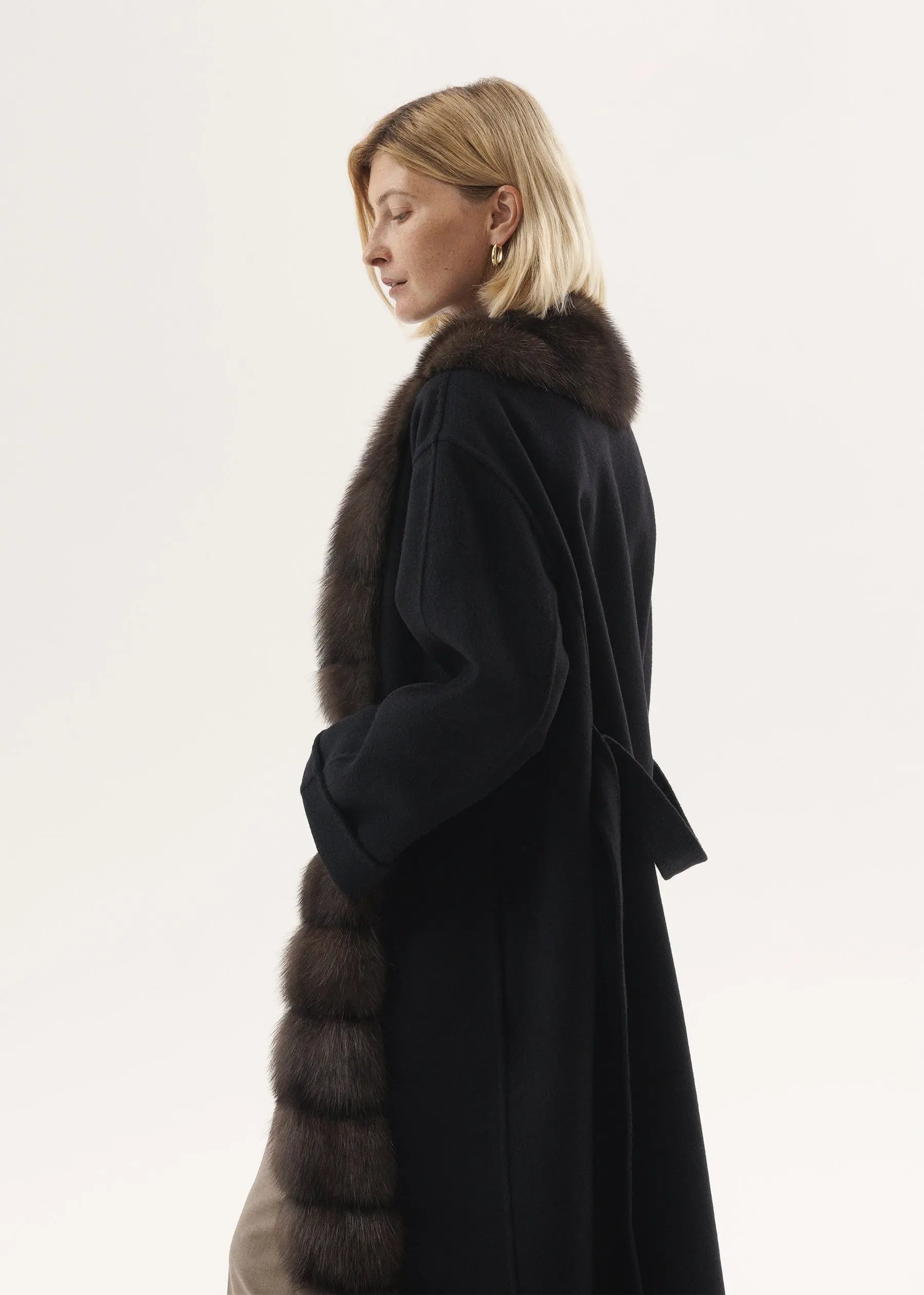 Der Kaschmirmantel ist mit verdeckten Verschlüssen entlang des Fellbesatzes und mit praktischen Leistentaschen ausgestattet.