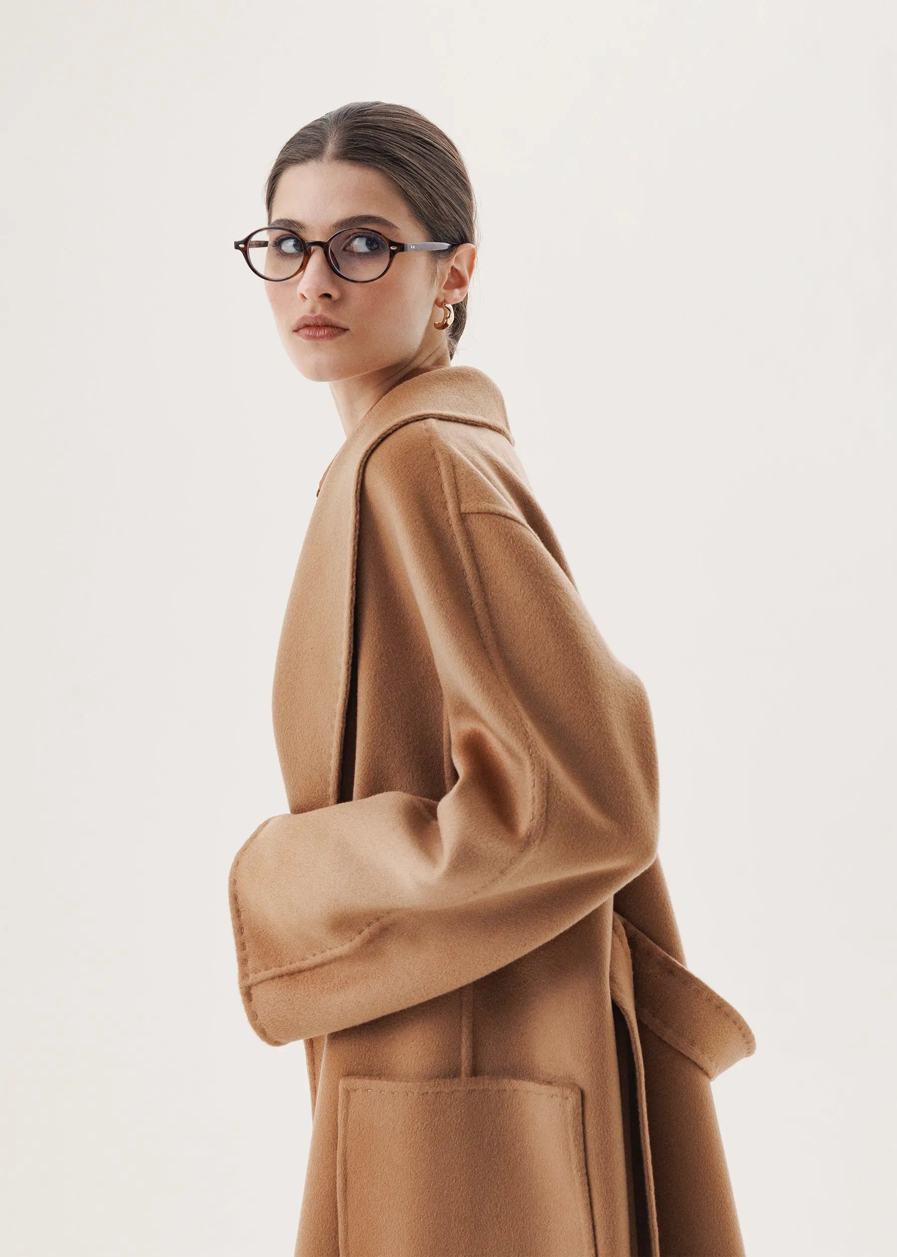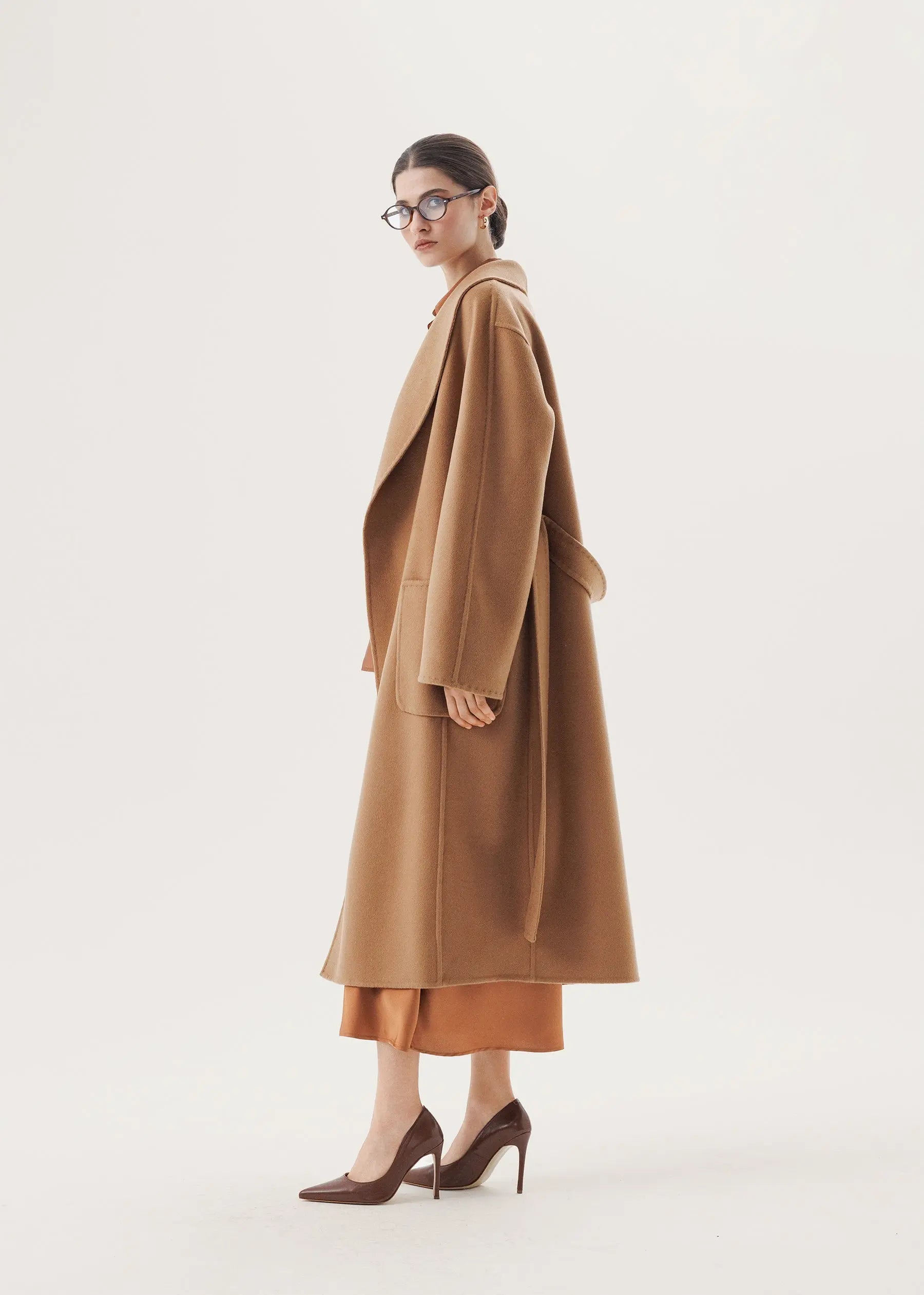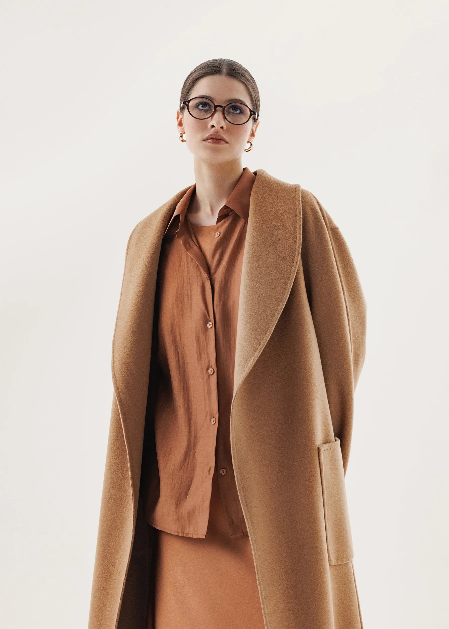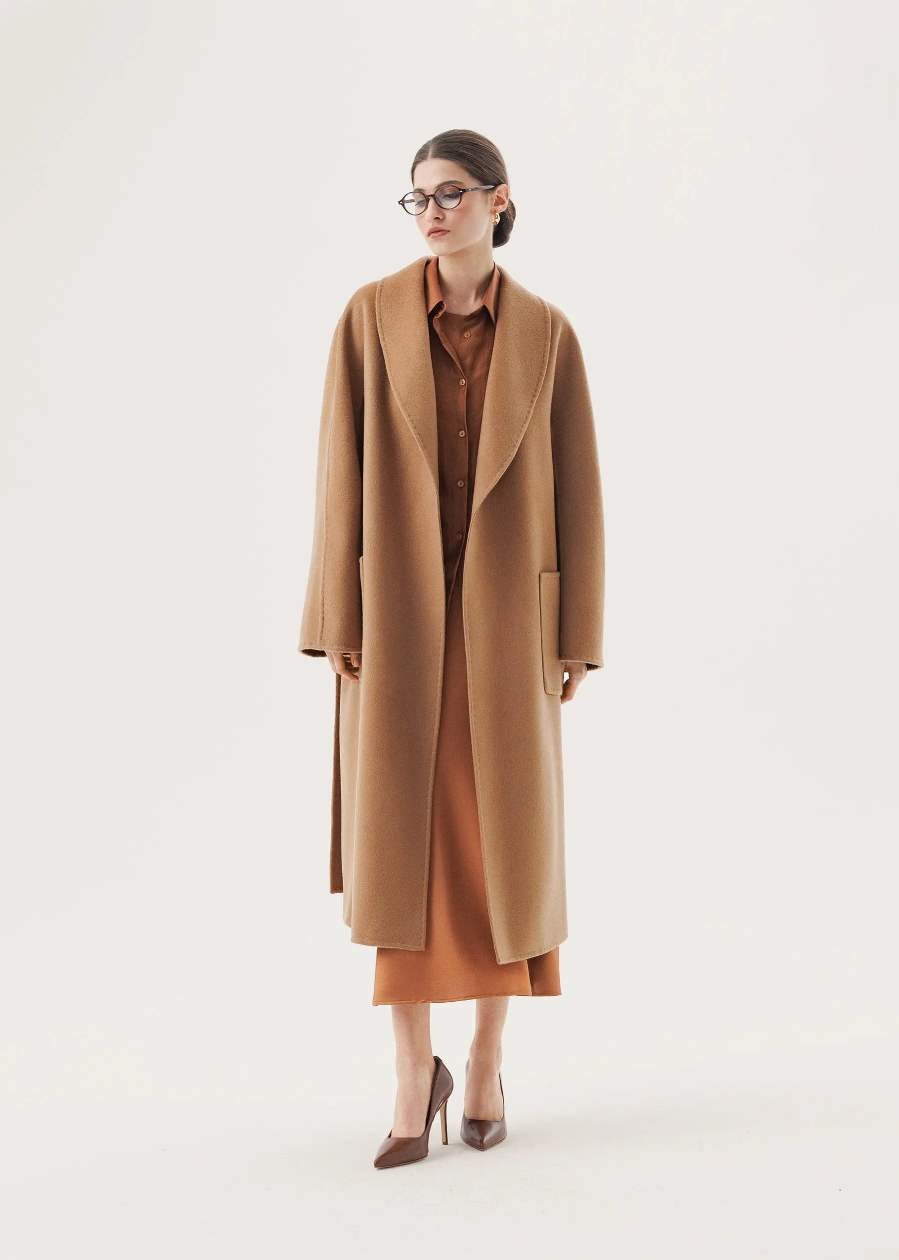 Klassischer Kaschmirmantel mit elegantem Schalkragen in der Farbe Camel.