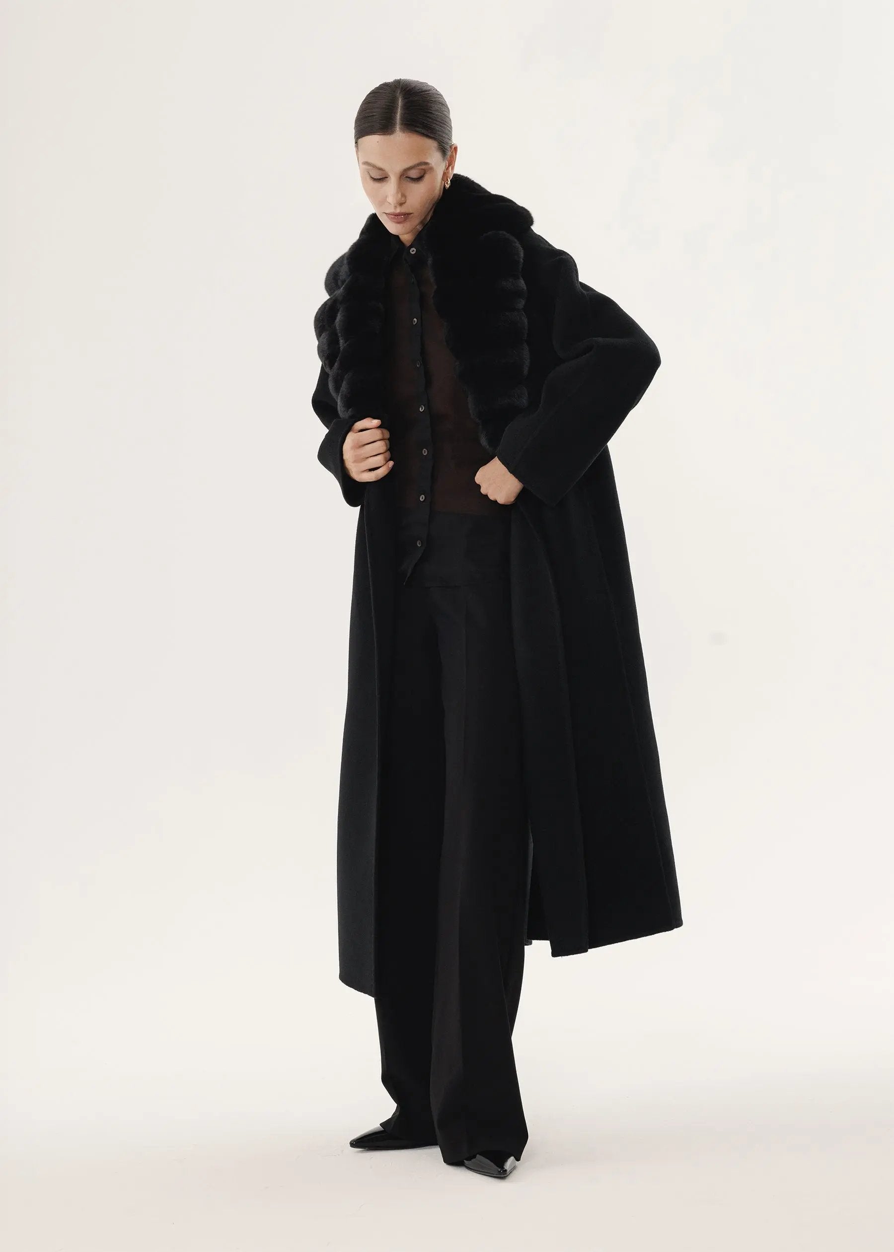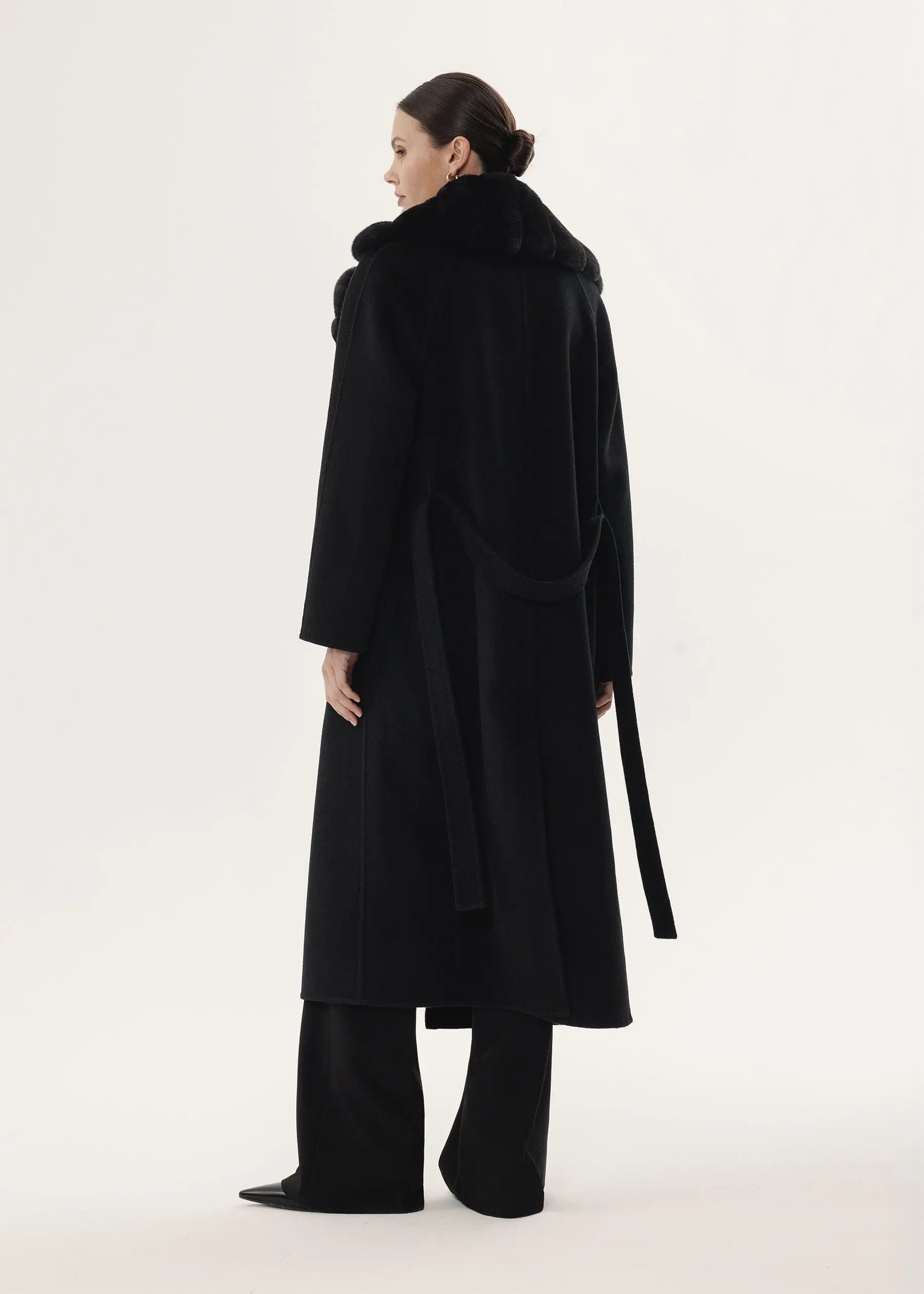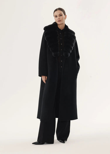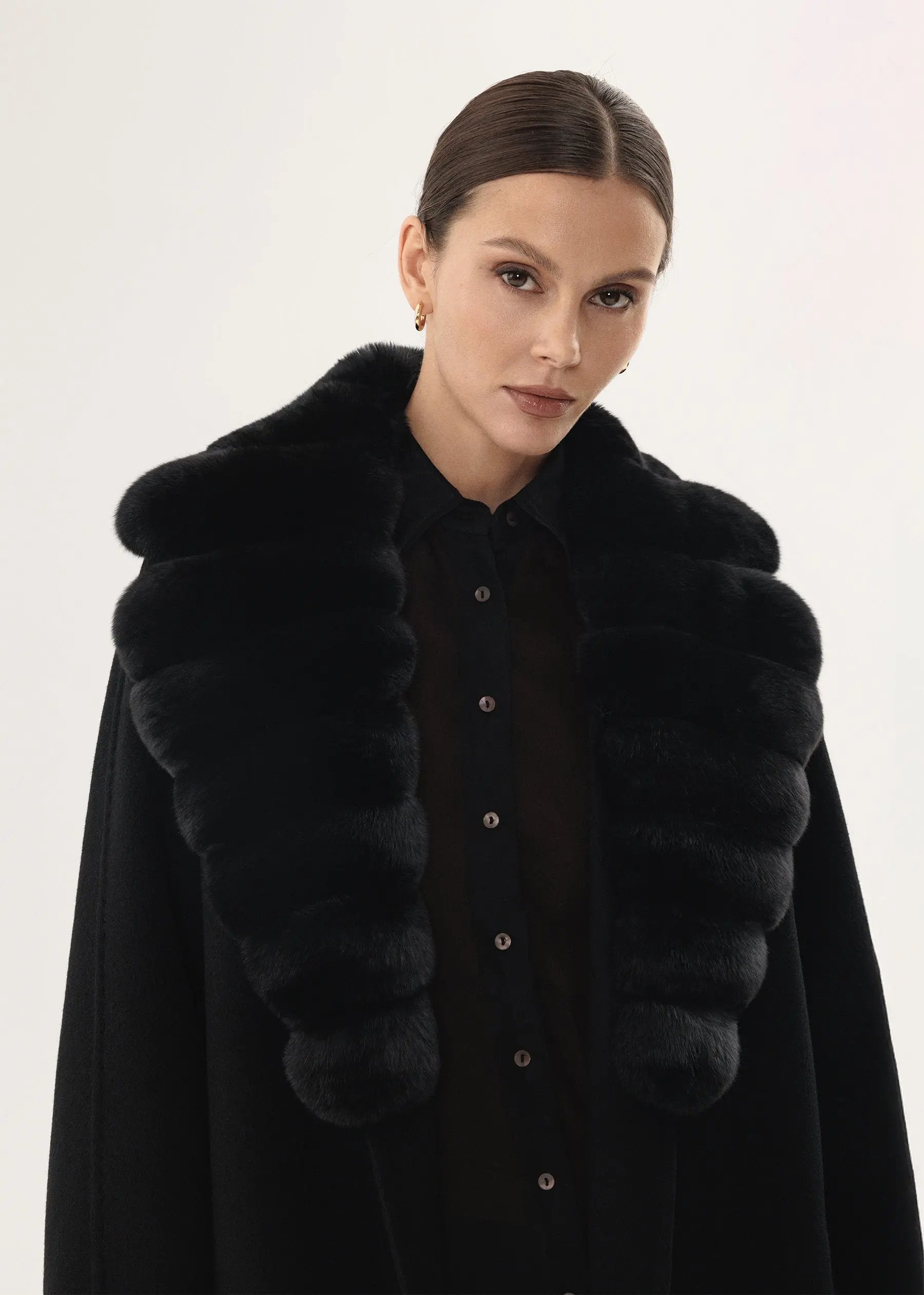 Schwarzes Kaschmirmantel mit Chinchilla-Pelzkragen