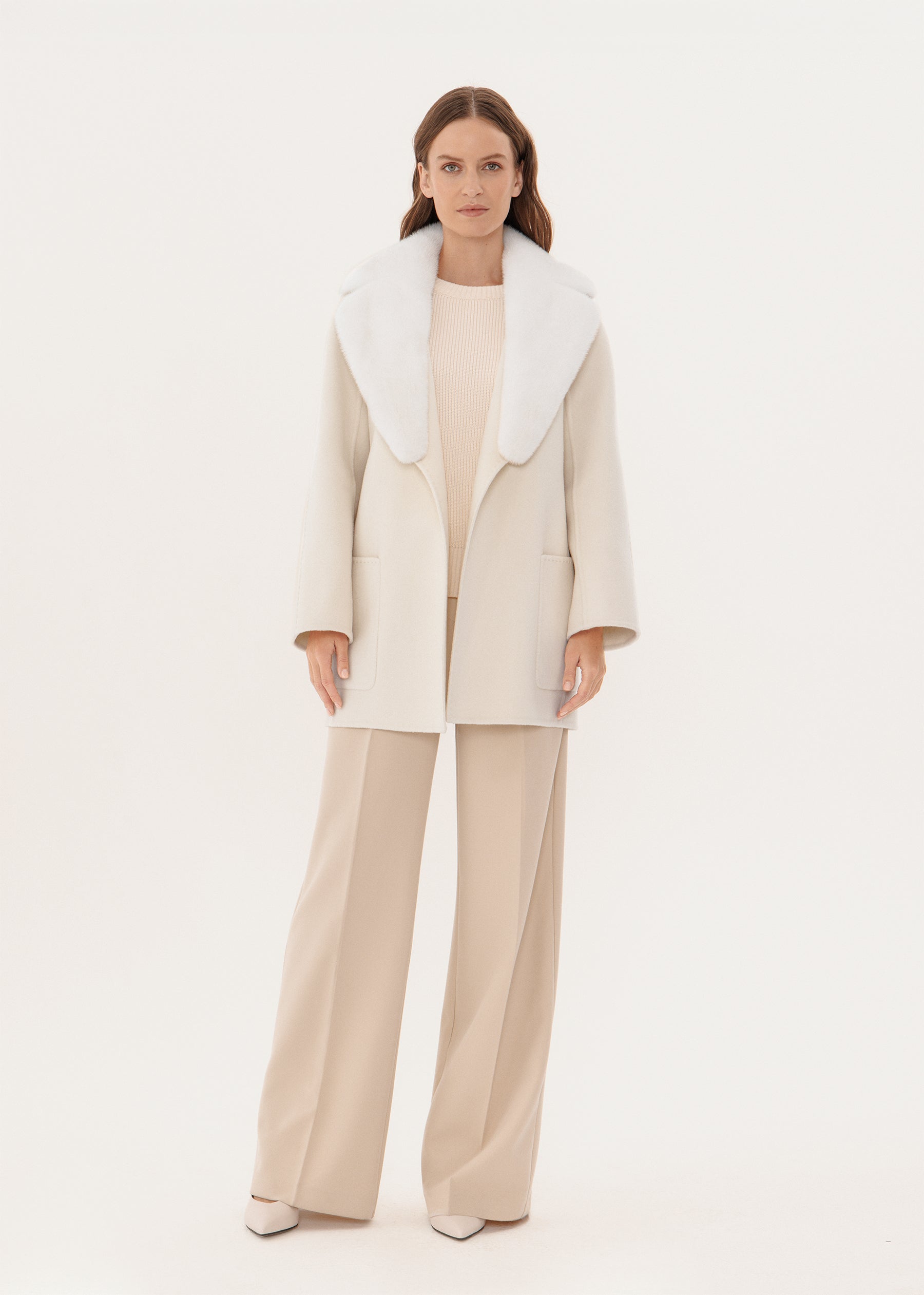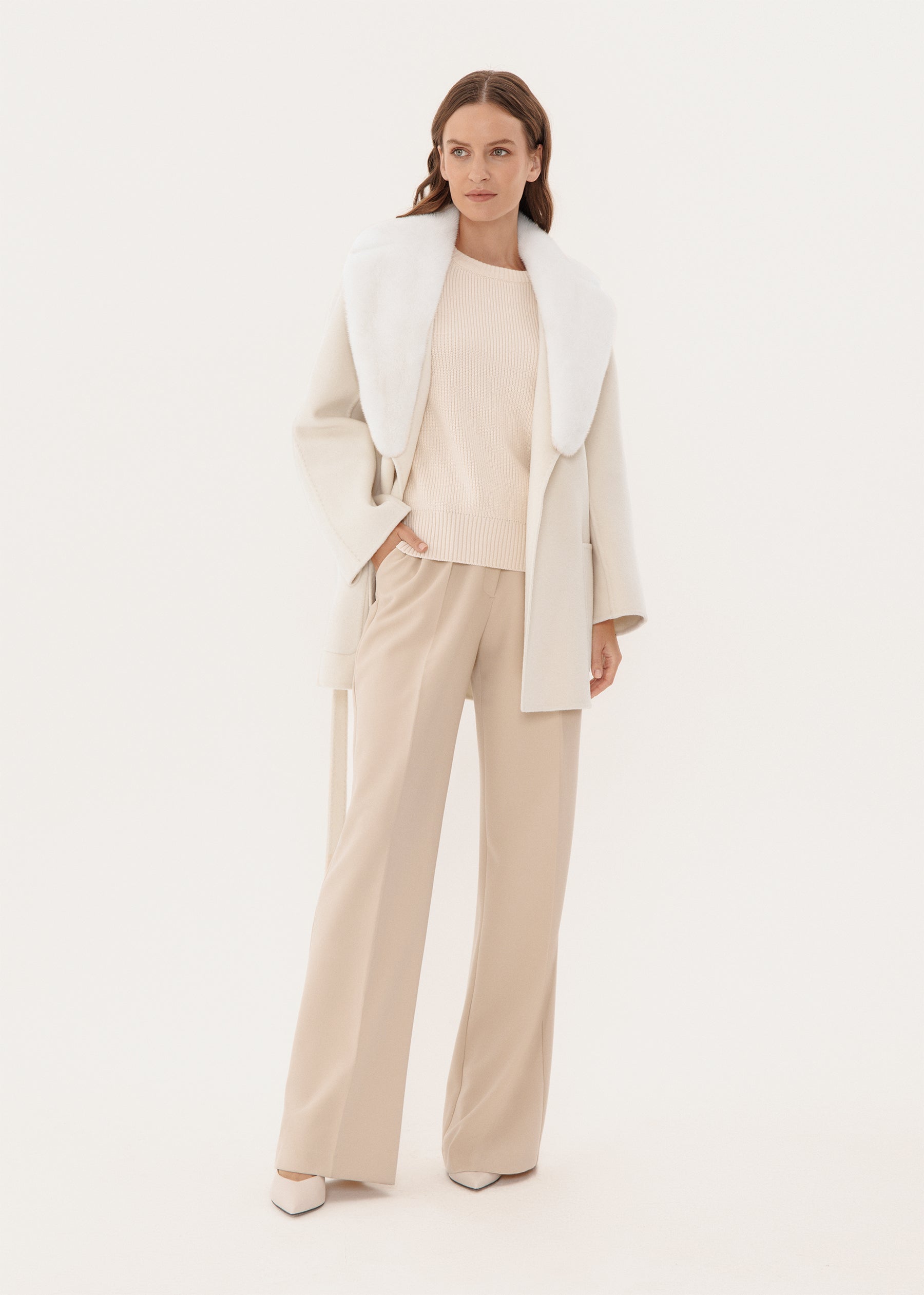Der Kaschmirmantel mit Nerz klassischem Kragen ist bequem, gerade geschnitten und Robe-like mit einem passenden Gürtel, der Ihre Taille perfekt betont sowie kuscheligen, aufgesetzten Taschen.
