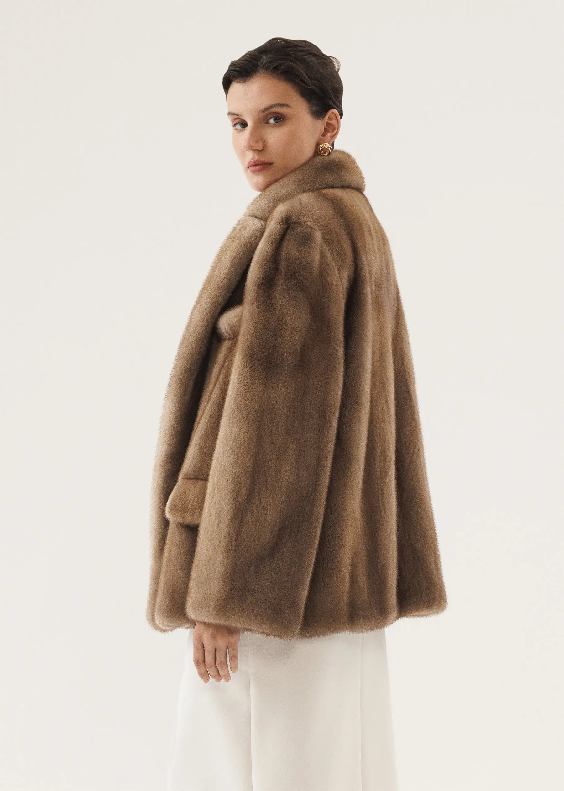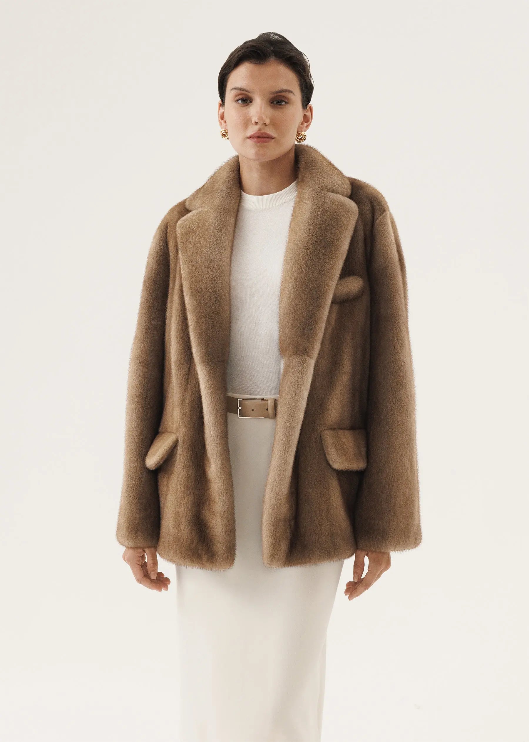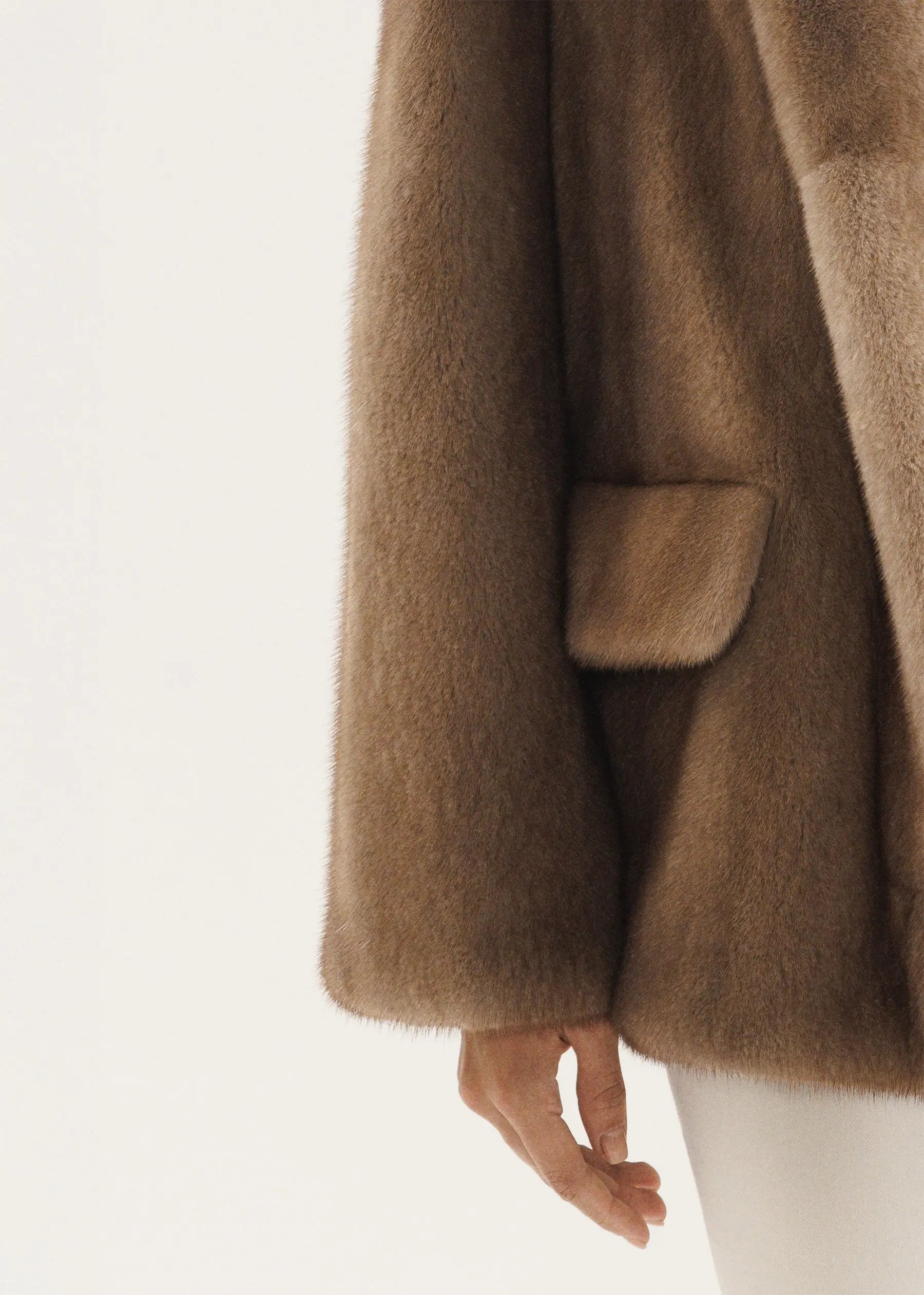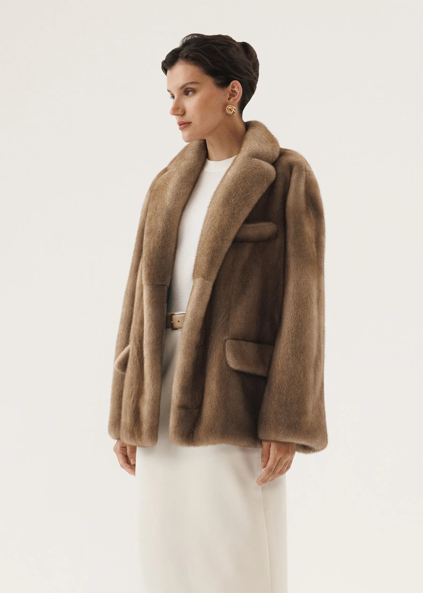 Klassisch geschnittene Nerzjacke mit kurzem Flor, englischem Reverskragen und überschnittenen Schultern.