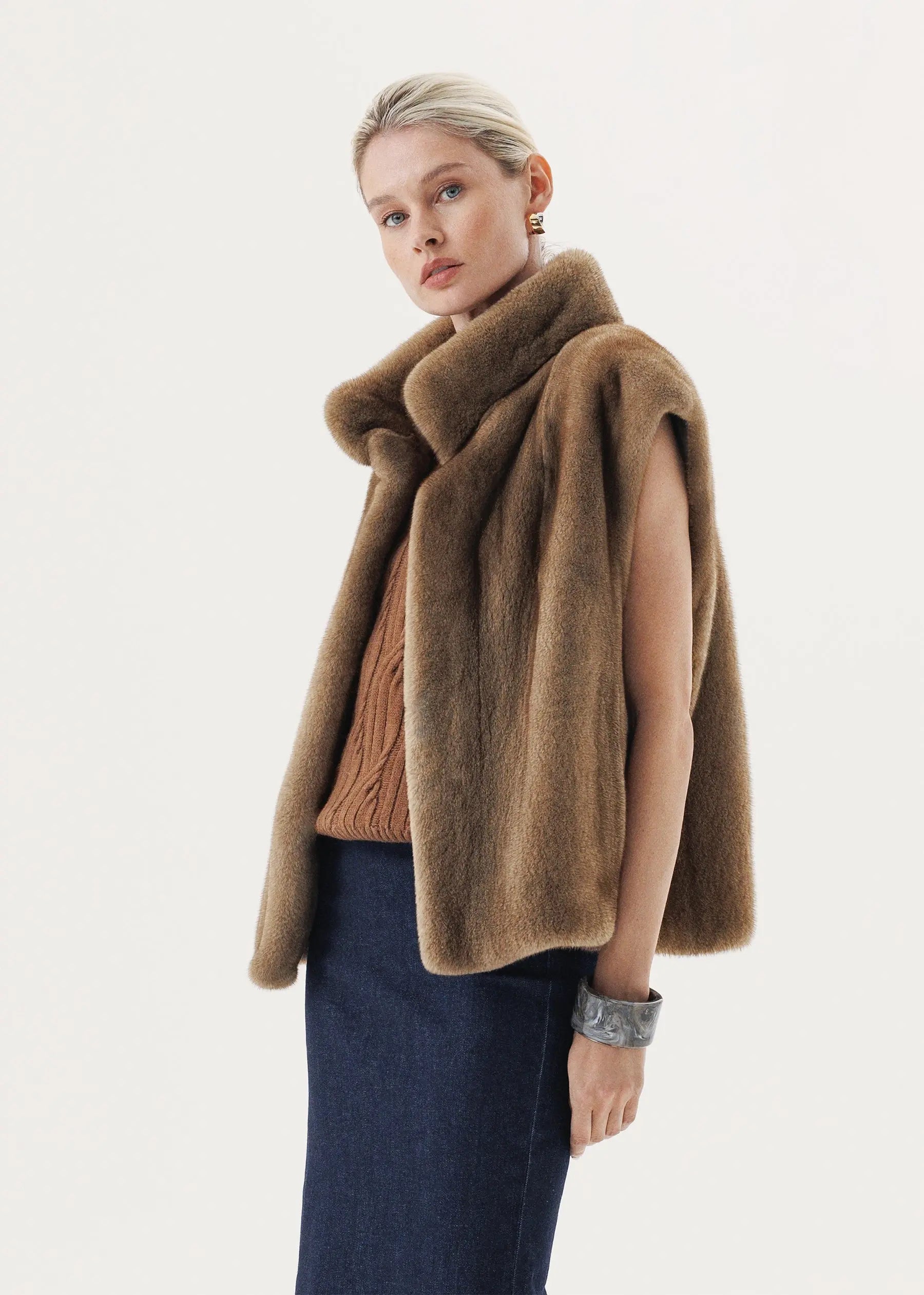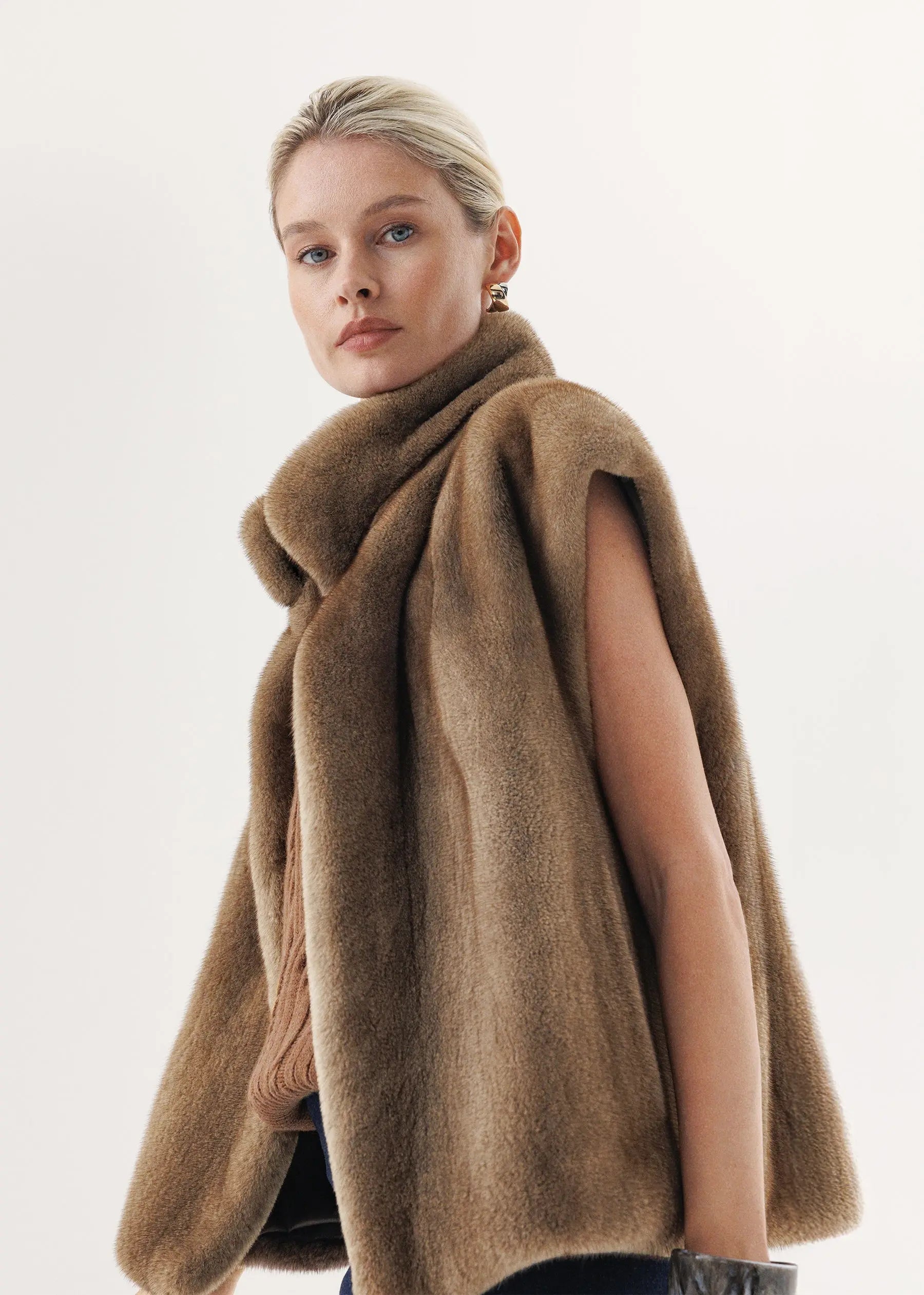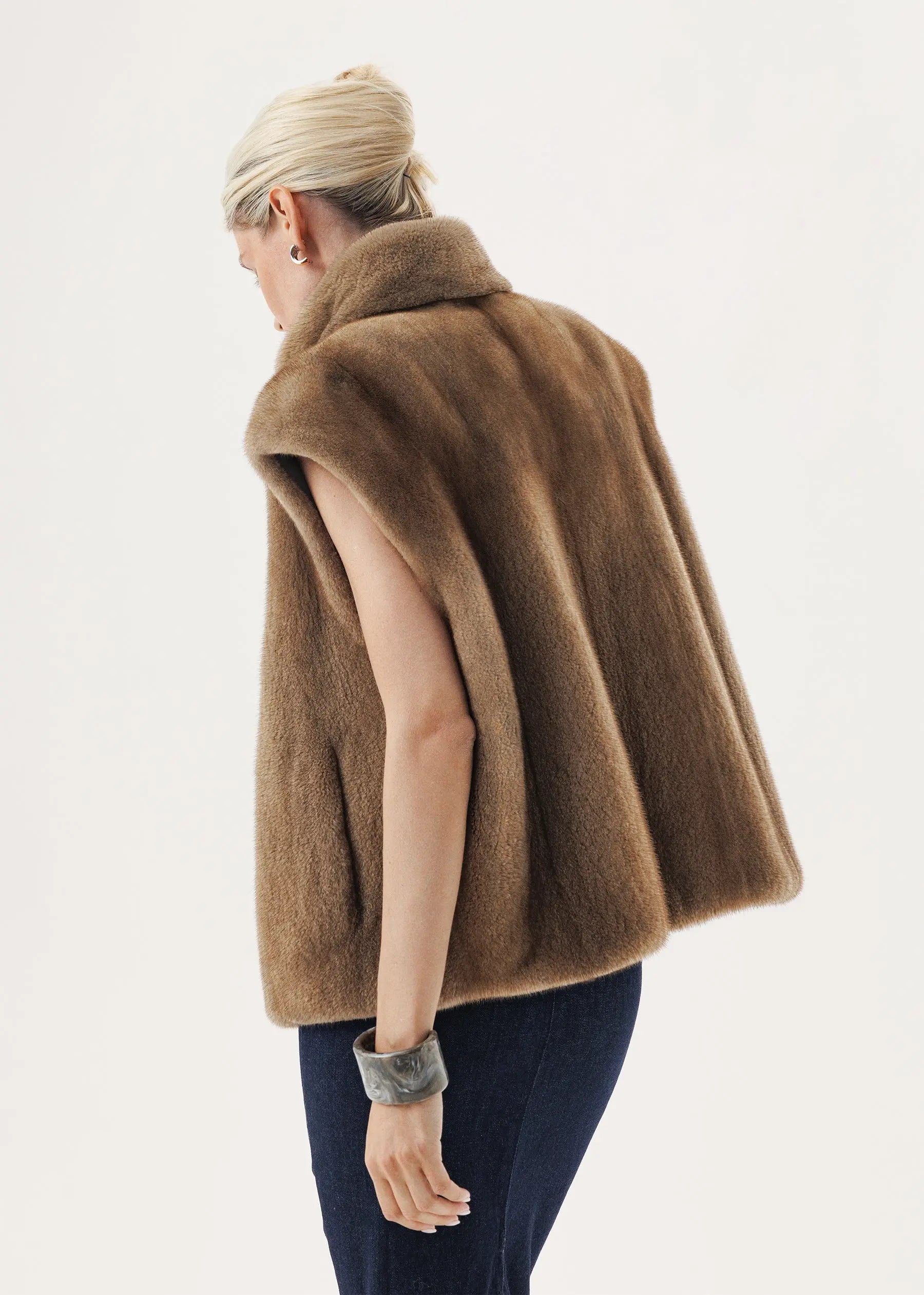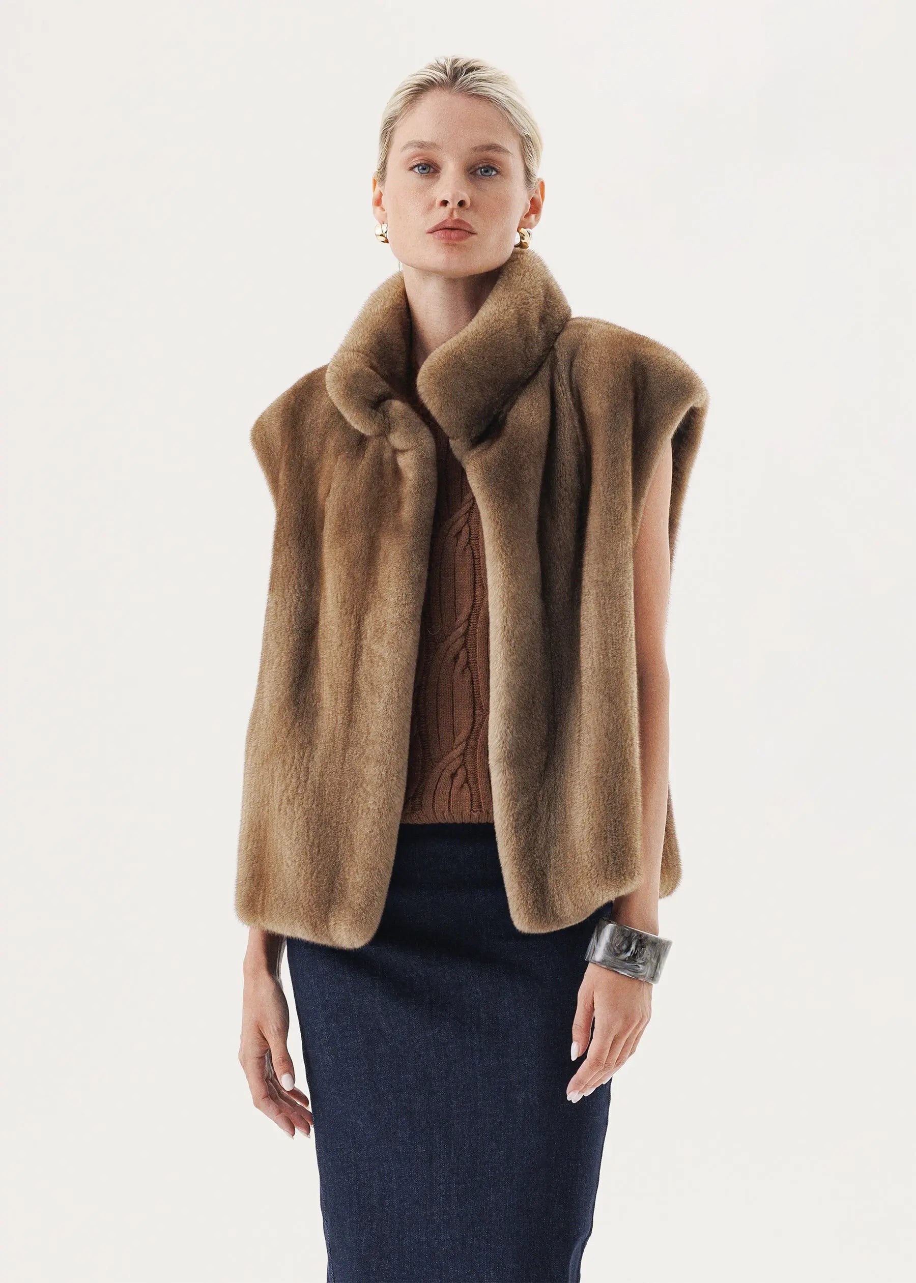 Kurzhaariger Nerz in einem zarten Pastellton macht aus einer lakonischen Weste einen dezenten Akzent der Herbst-Winter-Garderobe.