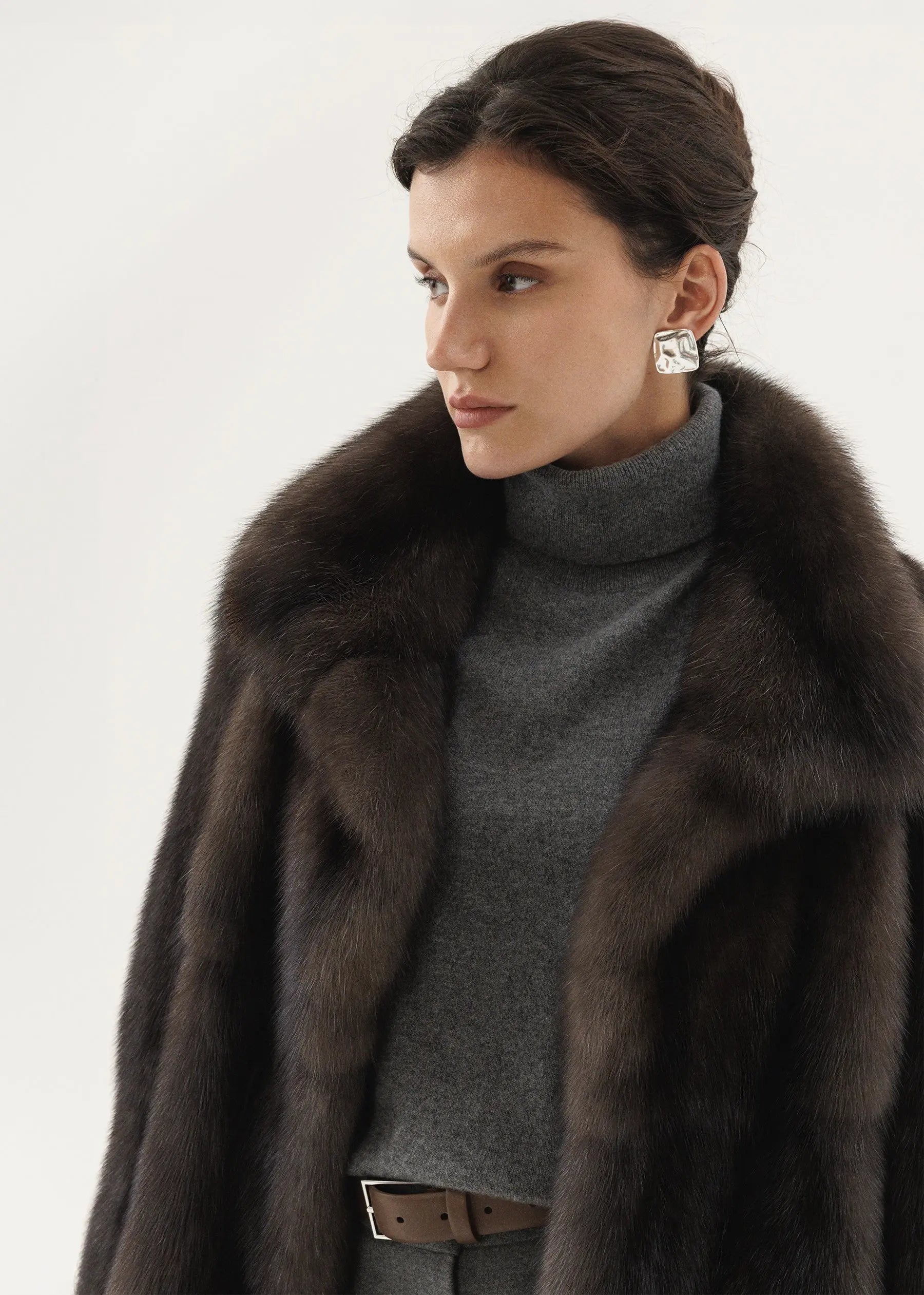 Ein gerader Schnitt, breite, gerade Ärmel, seitliche Eingrifftaschen, ein versteckter Verschluss hinter den Haken, eine komfortable Länge sind die markanten Details dieses Zobelfells.