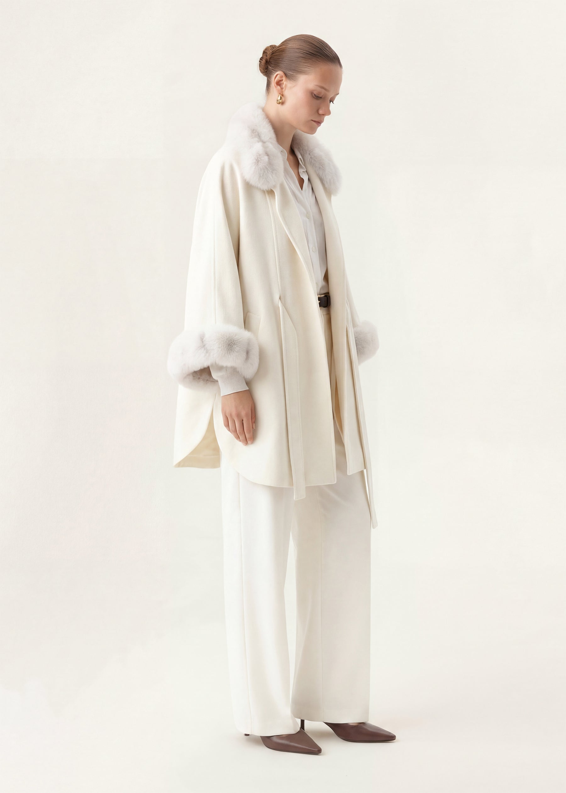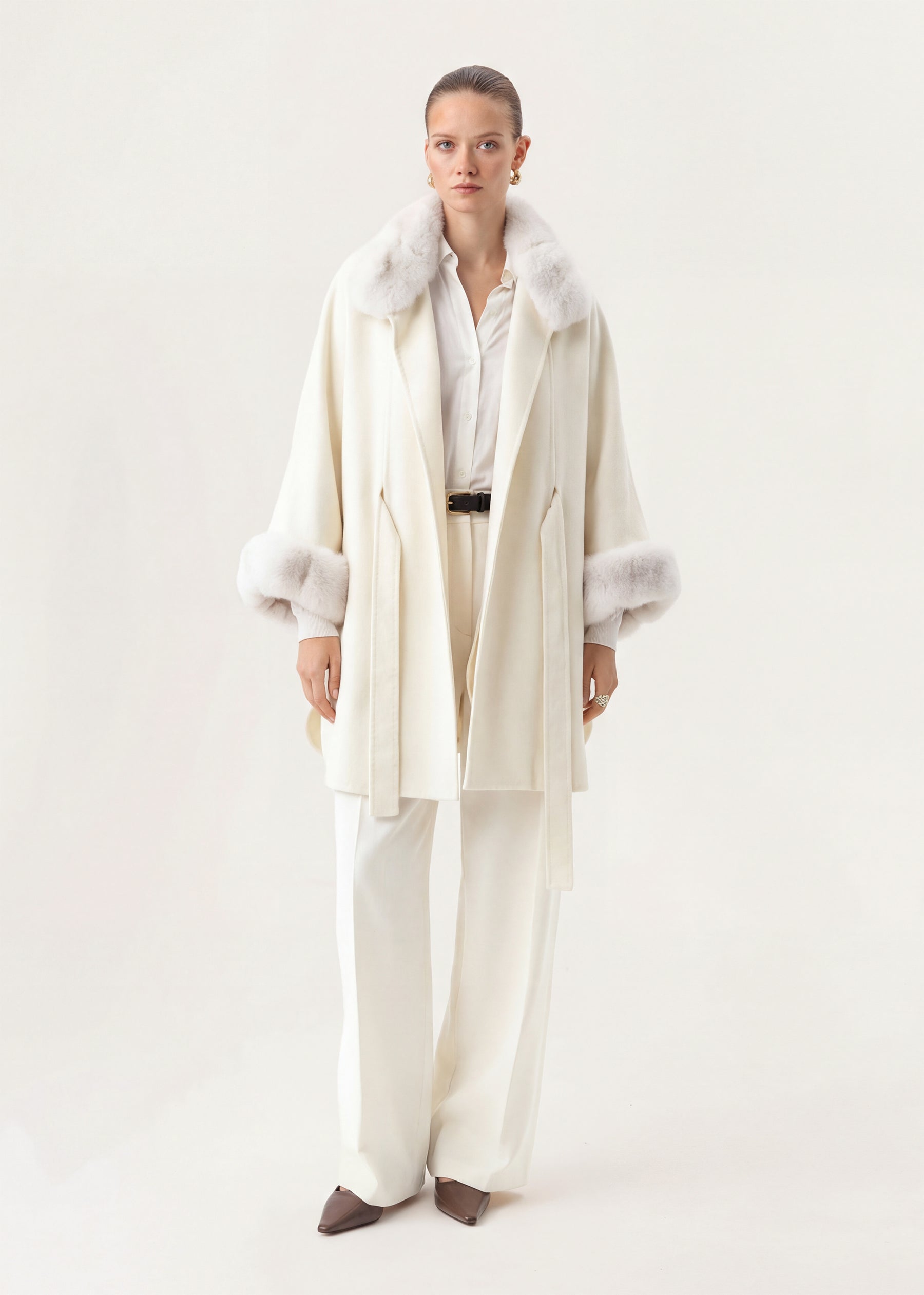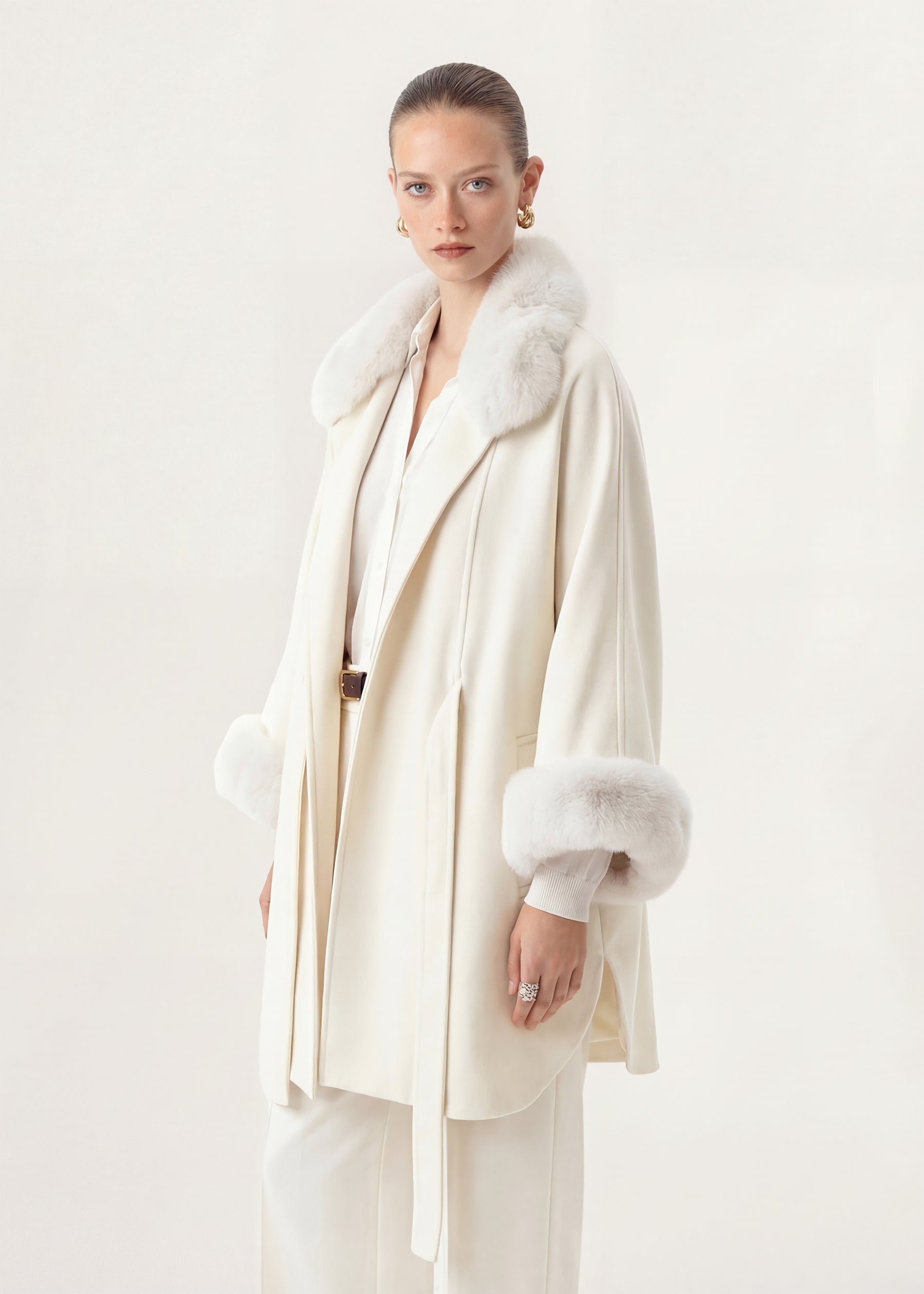 Details : Fur collar, fur cuffs, cashmere belt