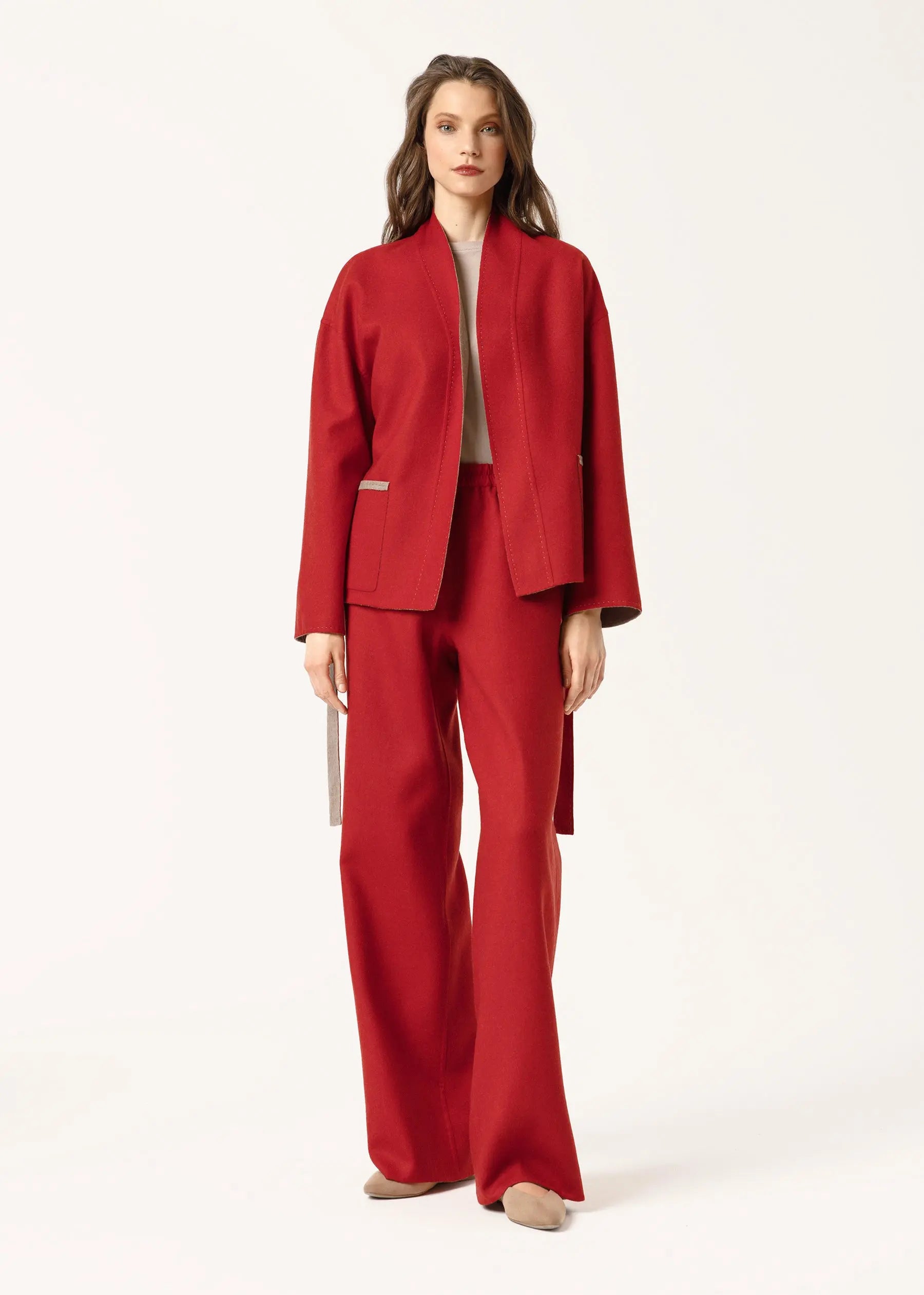 The trousers can be complemented with a reversible cashmere jacket in the same color scheme.