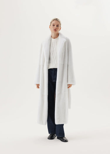 Le manteau est fini dans une luxueuse nuance de blanc brillant qui met en valeur l’éclat naturel de la fourrure.