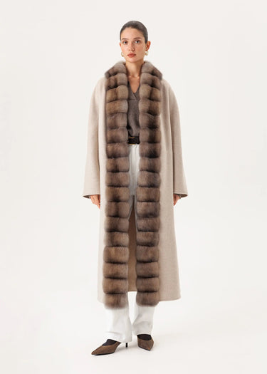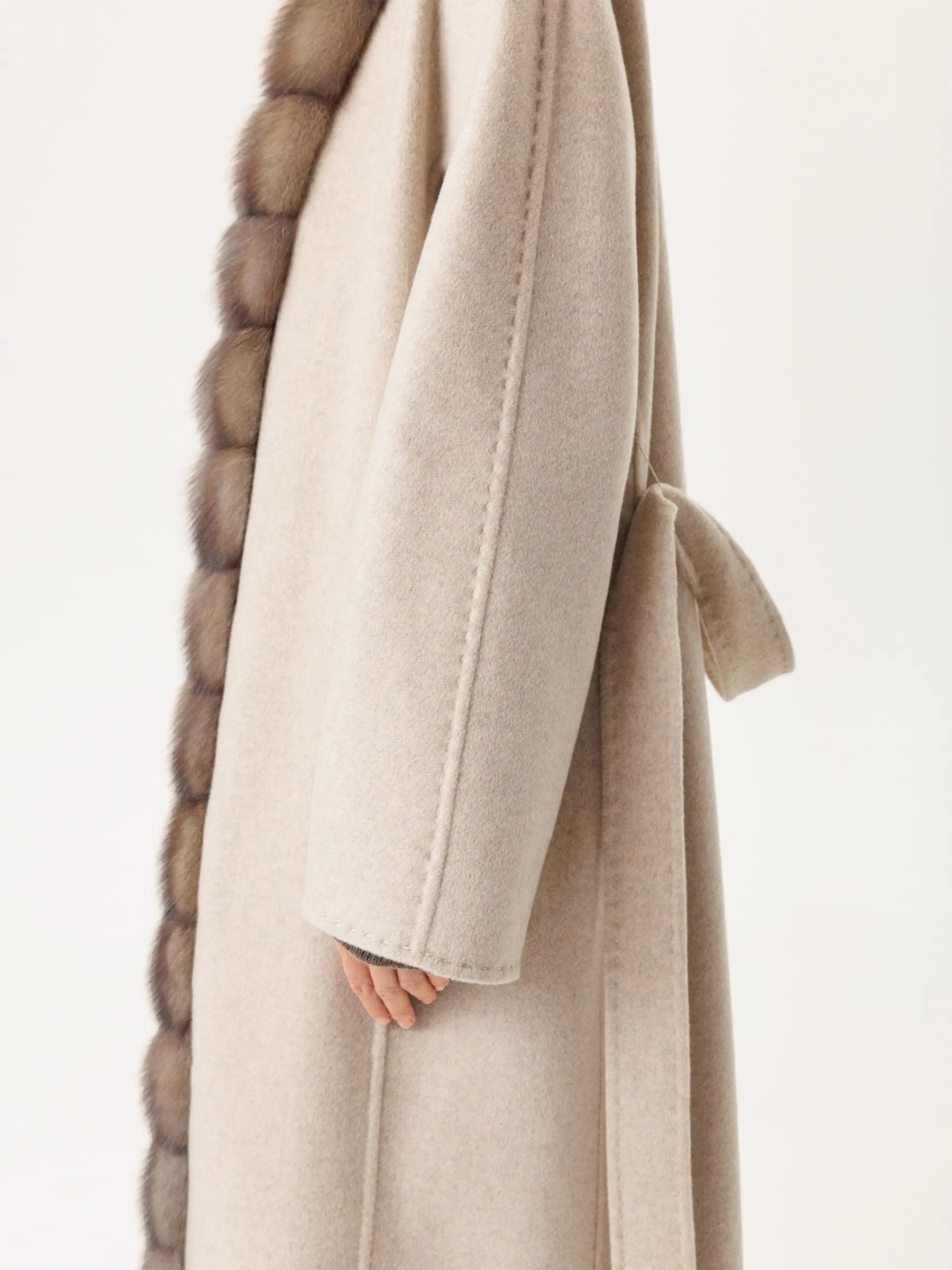 Kaschmirmantel in Beigeton mit Zobelfellbesatz an der Seite