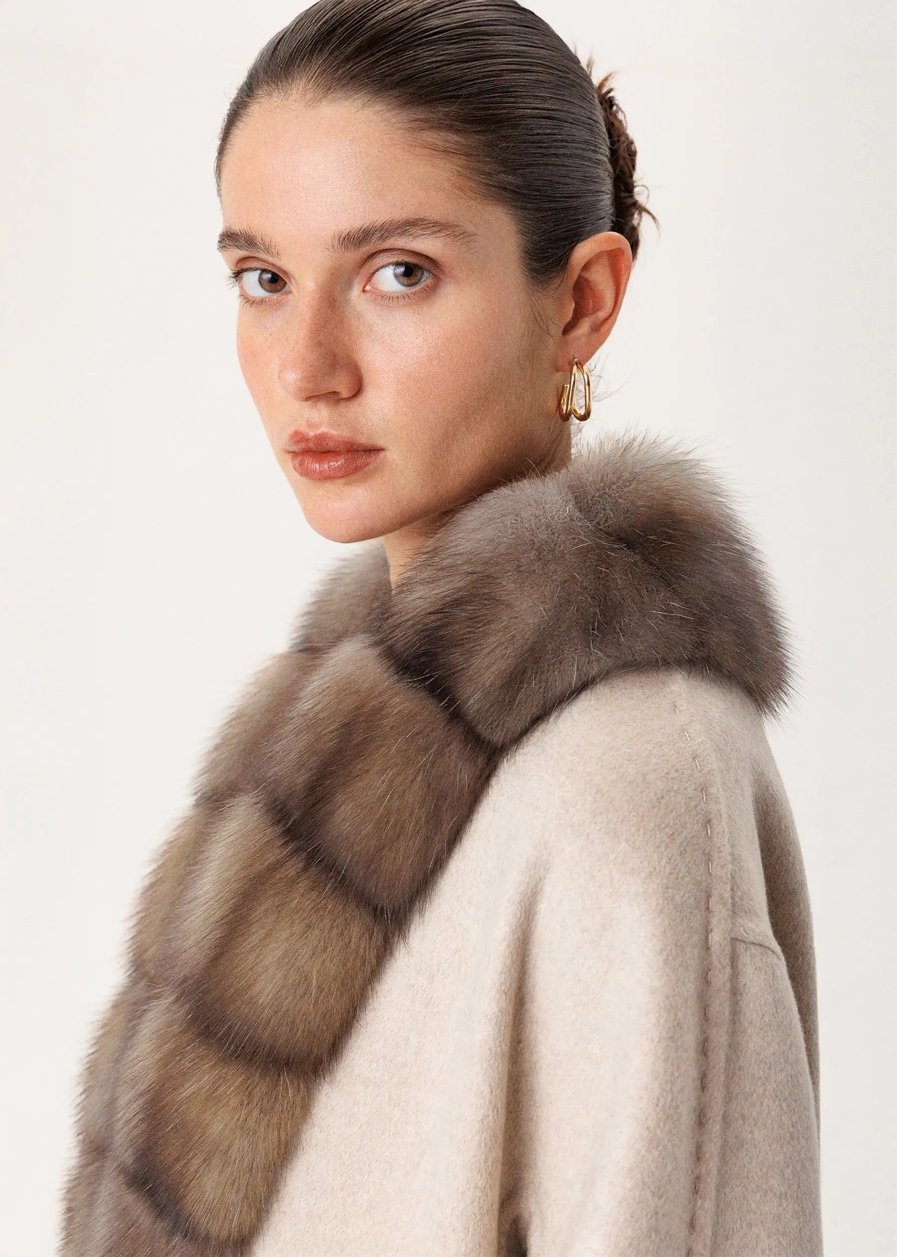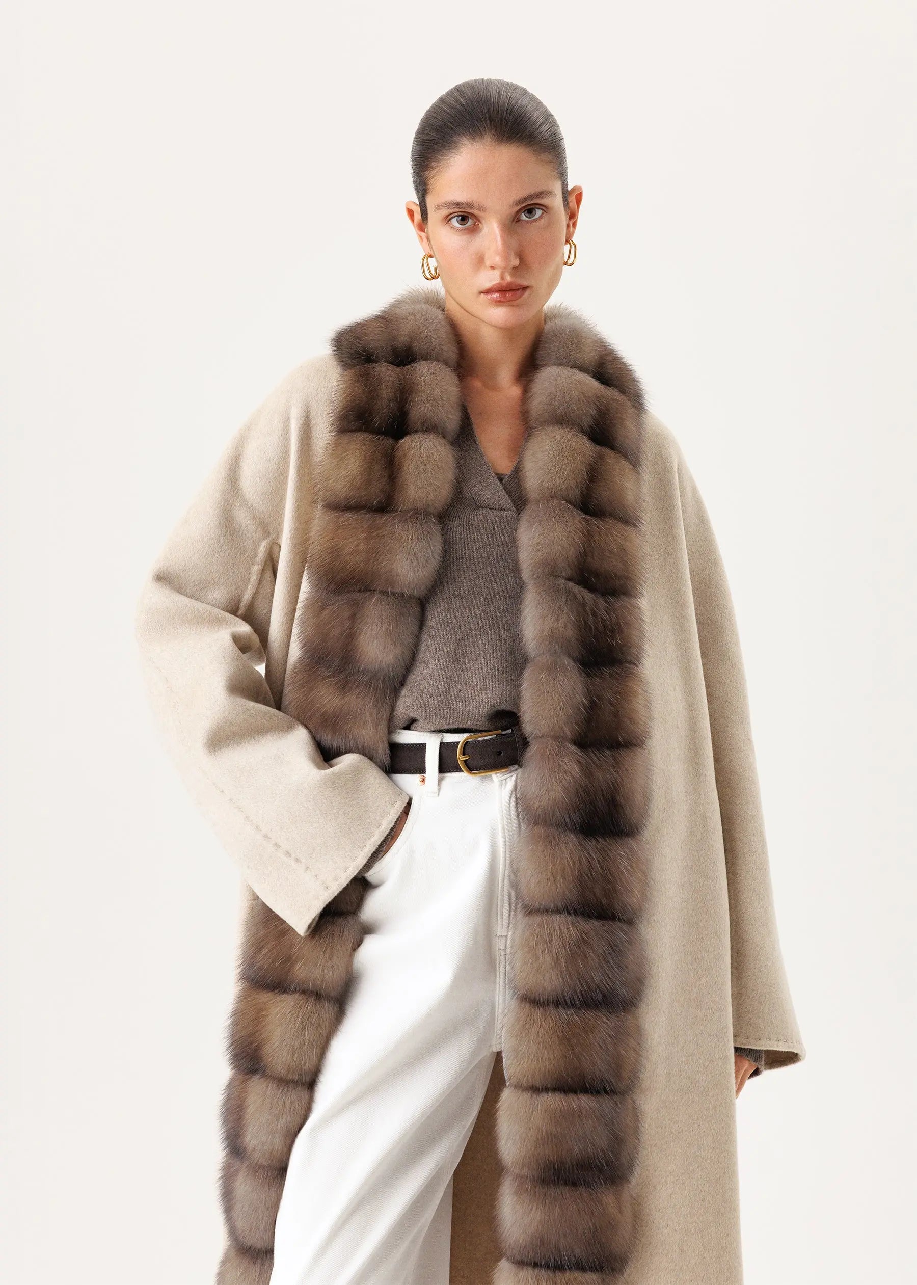 Ein Kaschmirmantel aus 100% italienischem Kaschmir im Beigeton, ergänzt durch einen Zobelfellbesatz entlang der gesamten Seite – er ist in der neuen Saison ein universelles Kleidungsstück in Ihrer Garderobe.