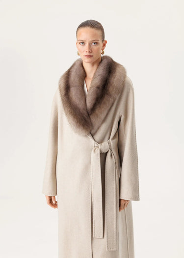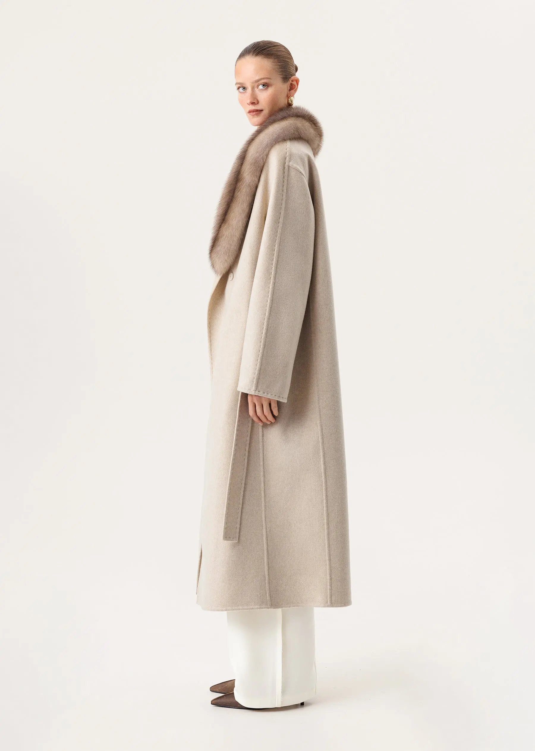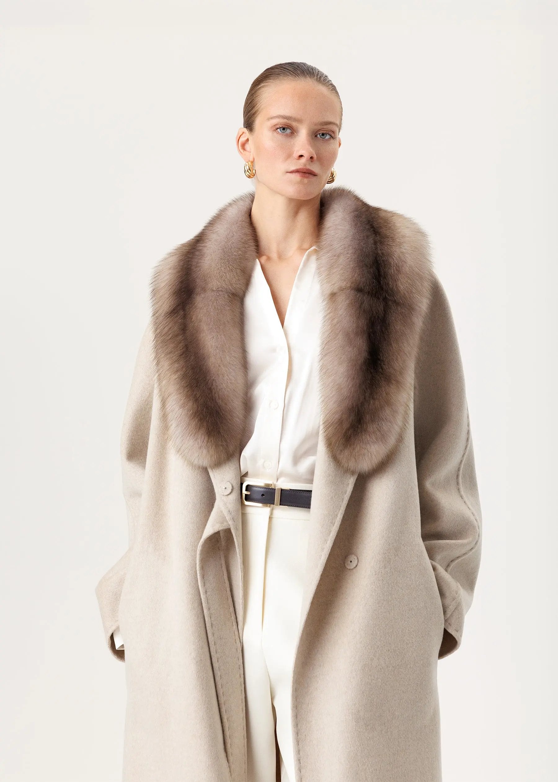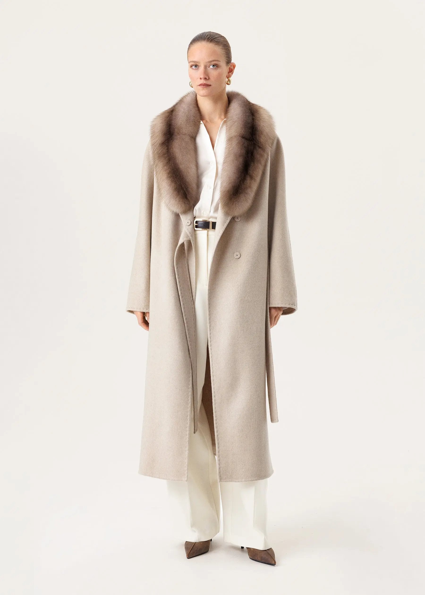 Der eingenähte Gürtel und die weichen Linien verleihen der Silhouette Feminität, während der Kragen aus Zobel dem Look einen Hauch von Raffinesse und Status verleiht.