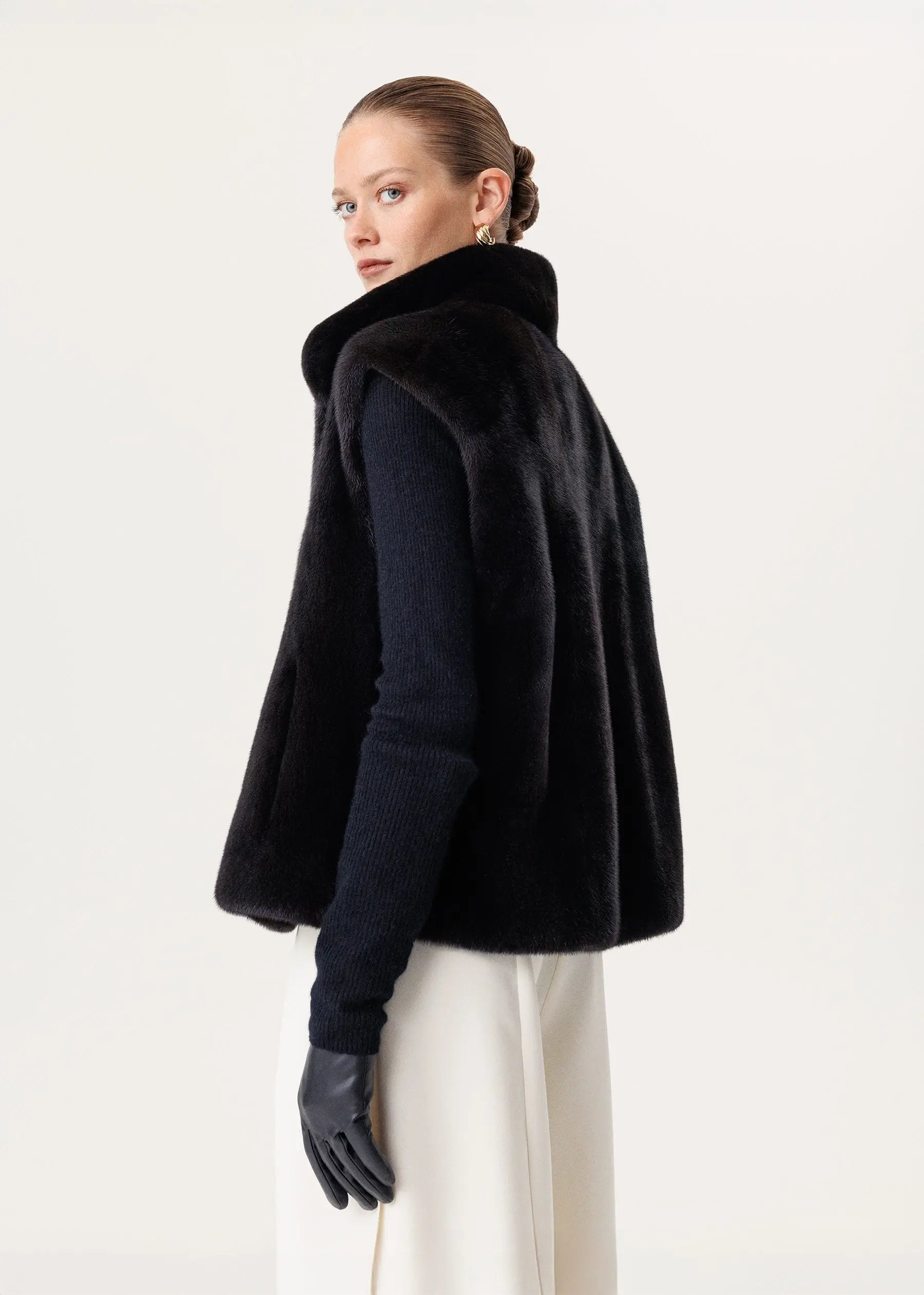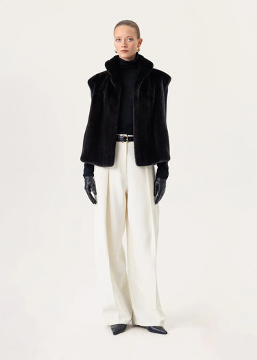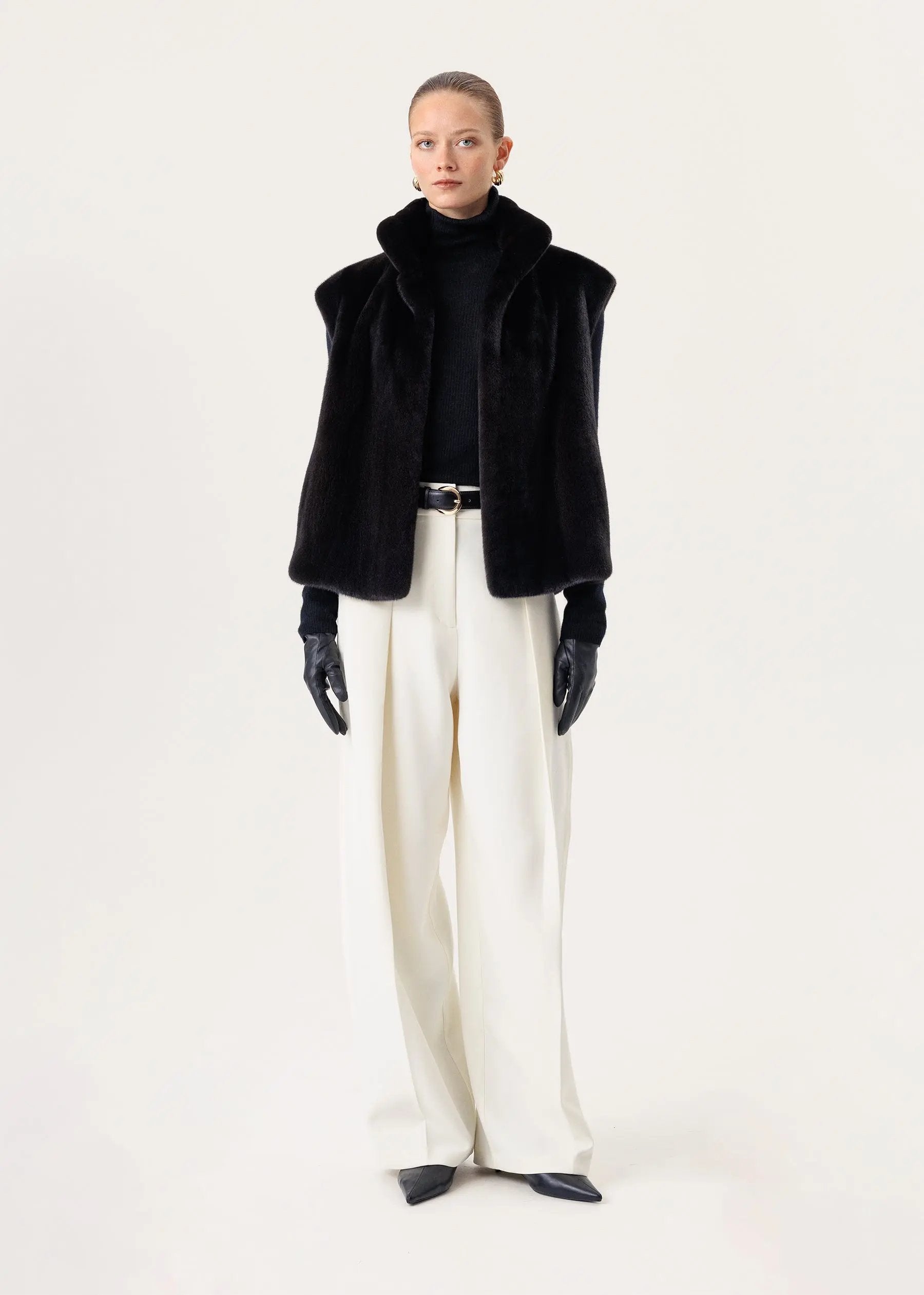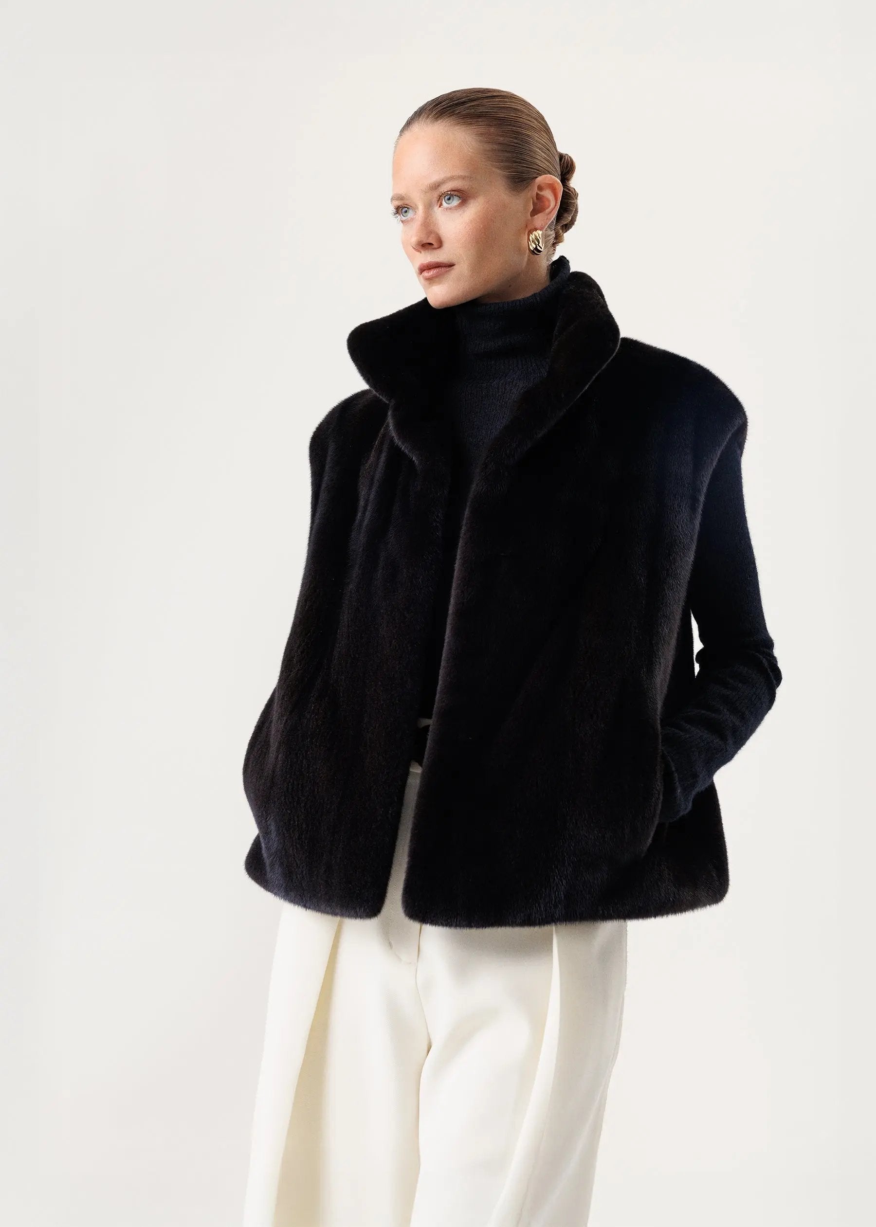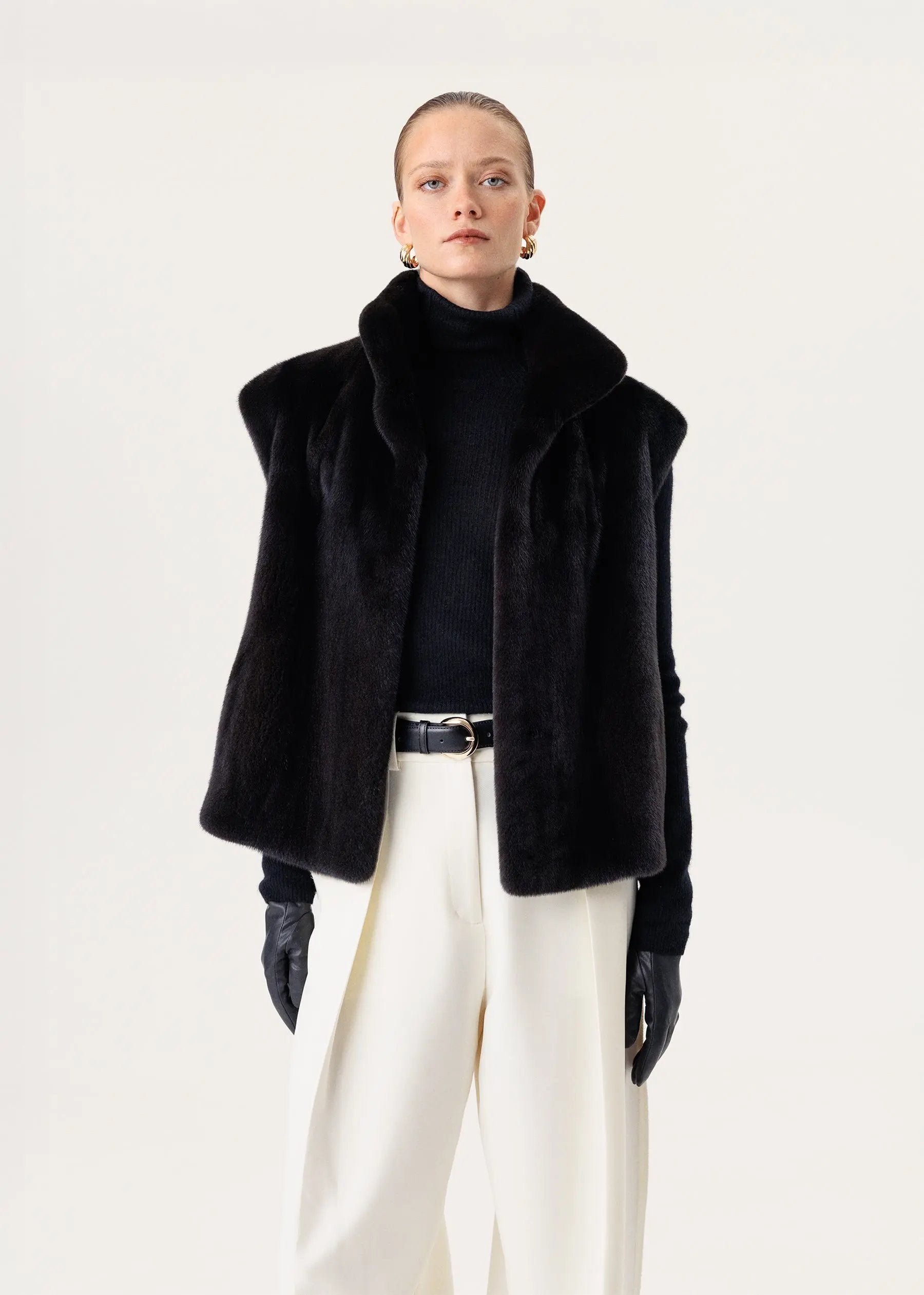 Die verkürzte Weste aus Nerzfell mit einer Länge von 60 cm eignet sich sowohl für gemütliche Alltagslooks als auch für elegante Abendoutfits.