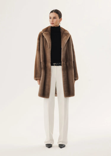 Eleganter Mantel mit gerader Silhouette und englischem Kragen aus skandinavischem Nerz in Pastellfarben.