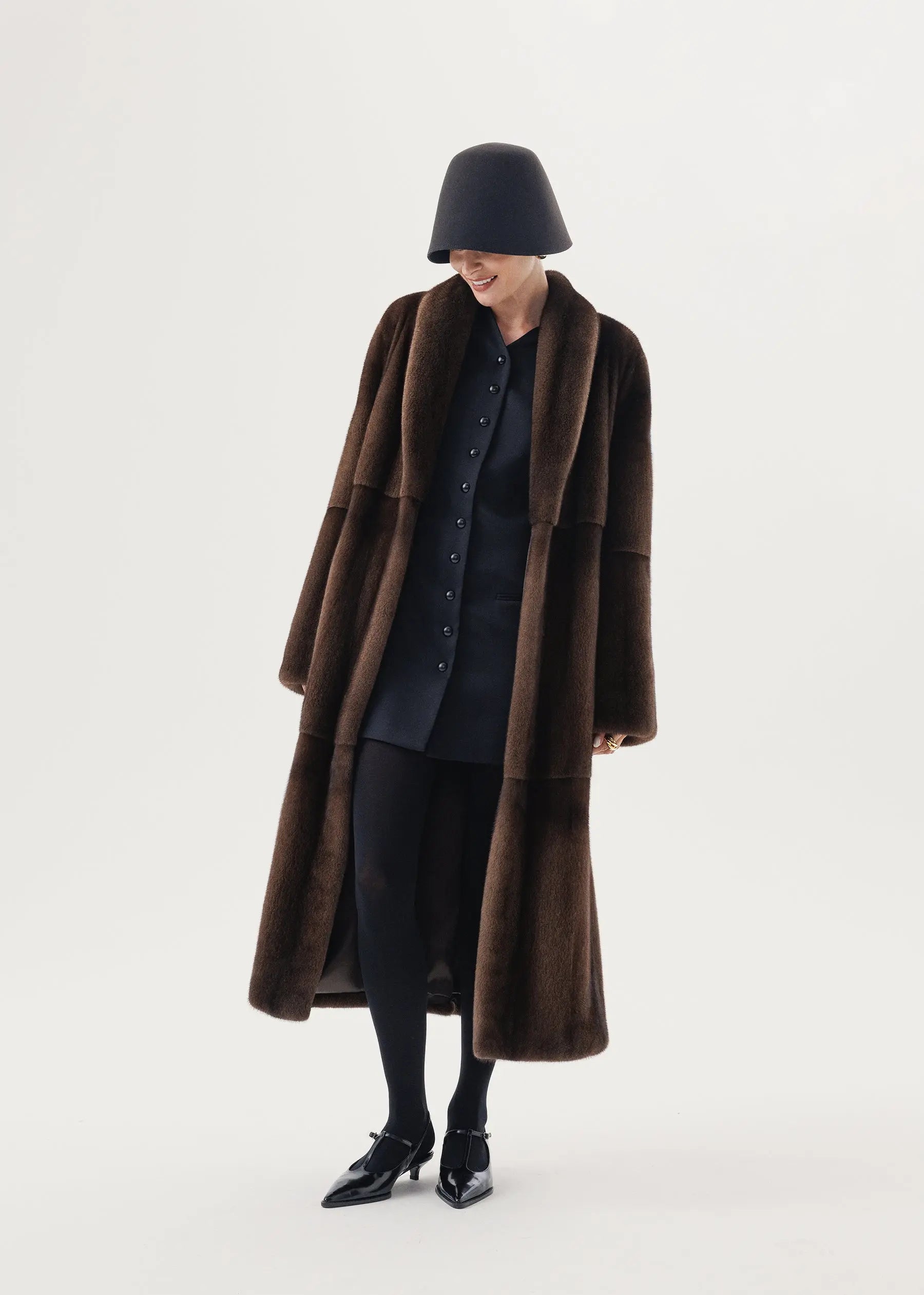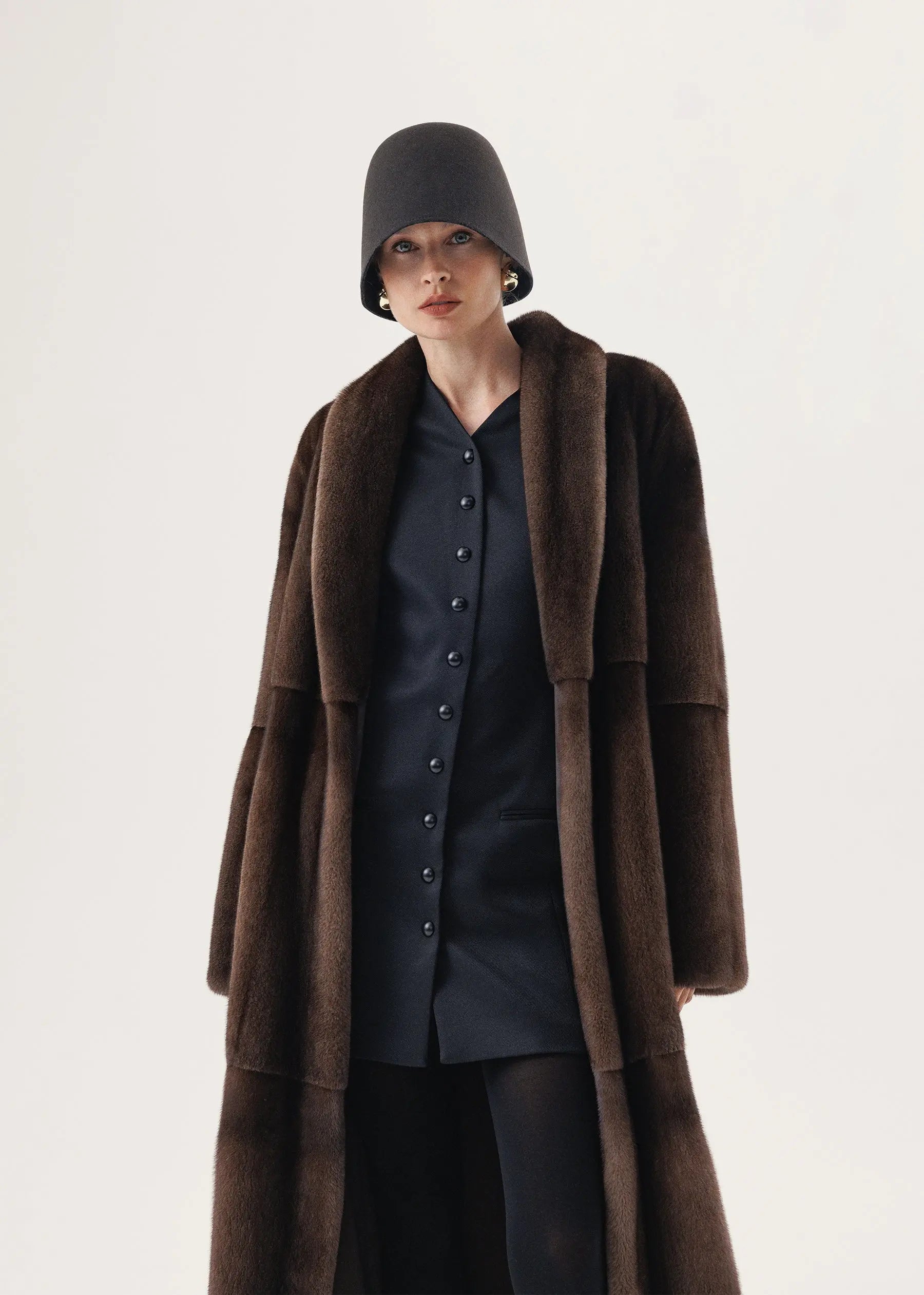 Der Nerzmantel im Farbton "Walnut" ist mit massiven vertikalen Fellplatten gefüttert - so entsteht eine langgestreckte und schlanke Grafik.